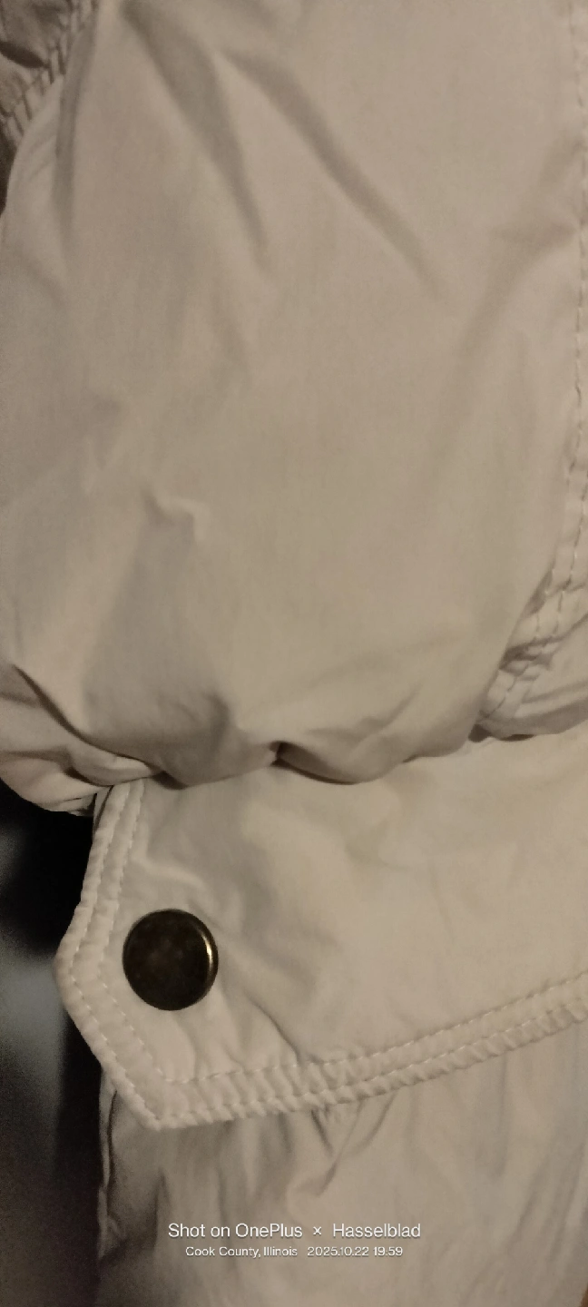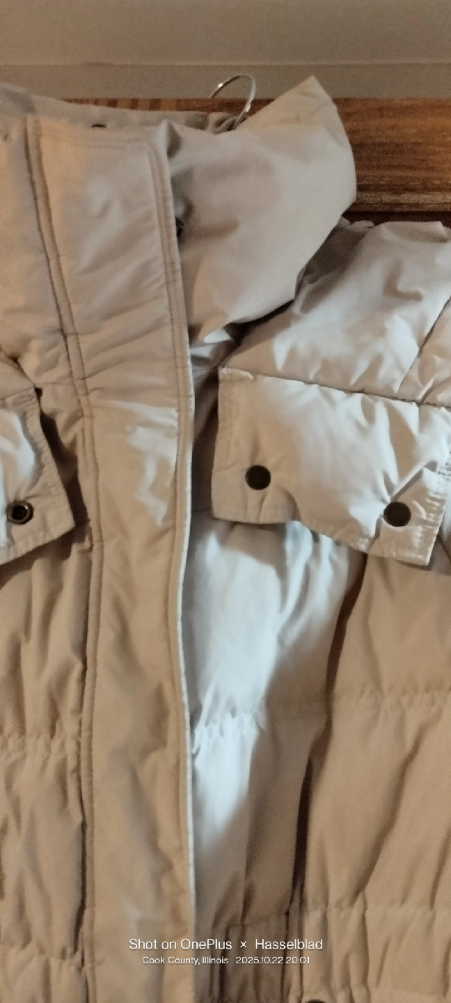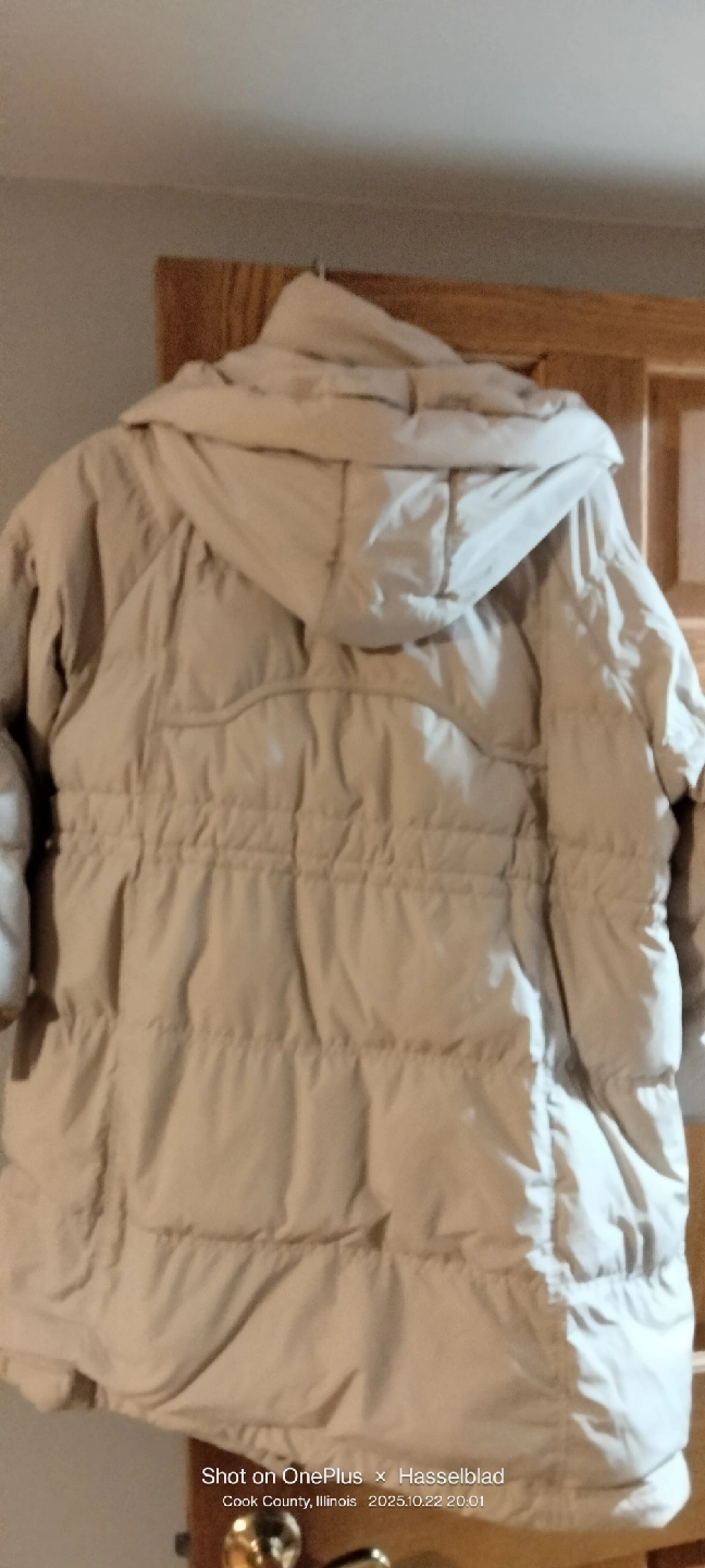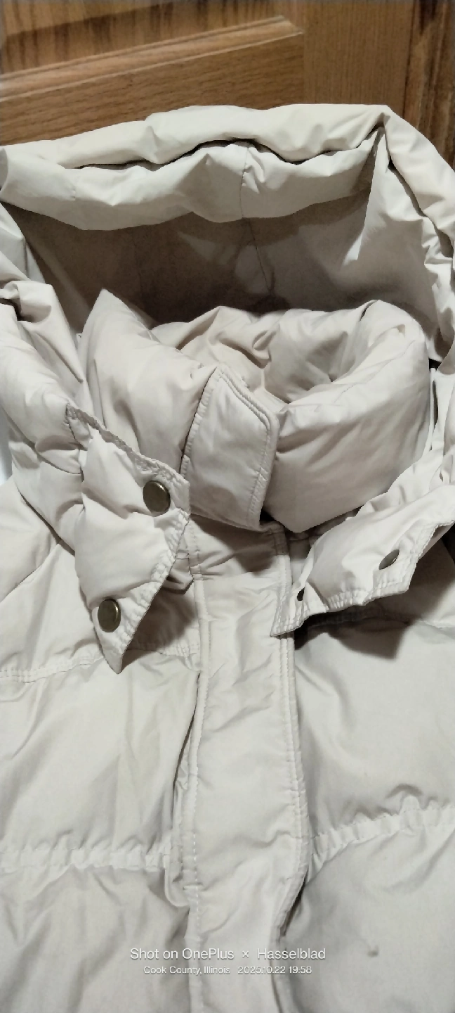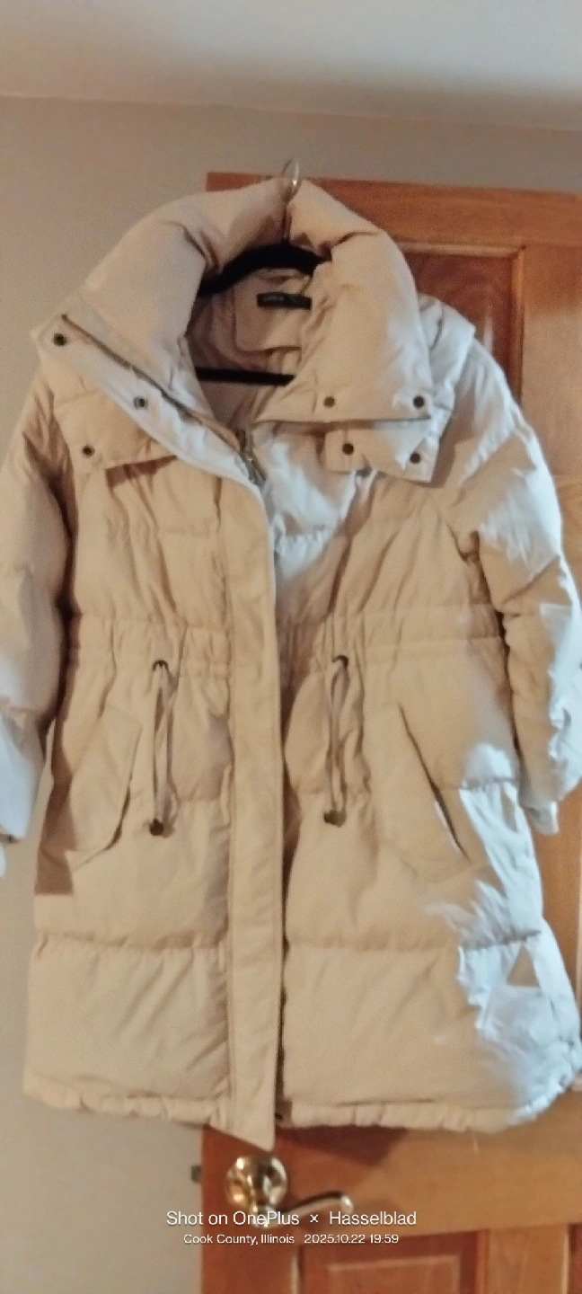 Selling a beige puffer jacket with a hood! It's in good condition and perfect for staying warm and cozy during the colder months. The jacket features a zipper closure and adjustable drawstrings for a customizable fit, along with convenient pockets