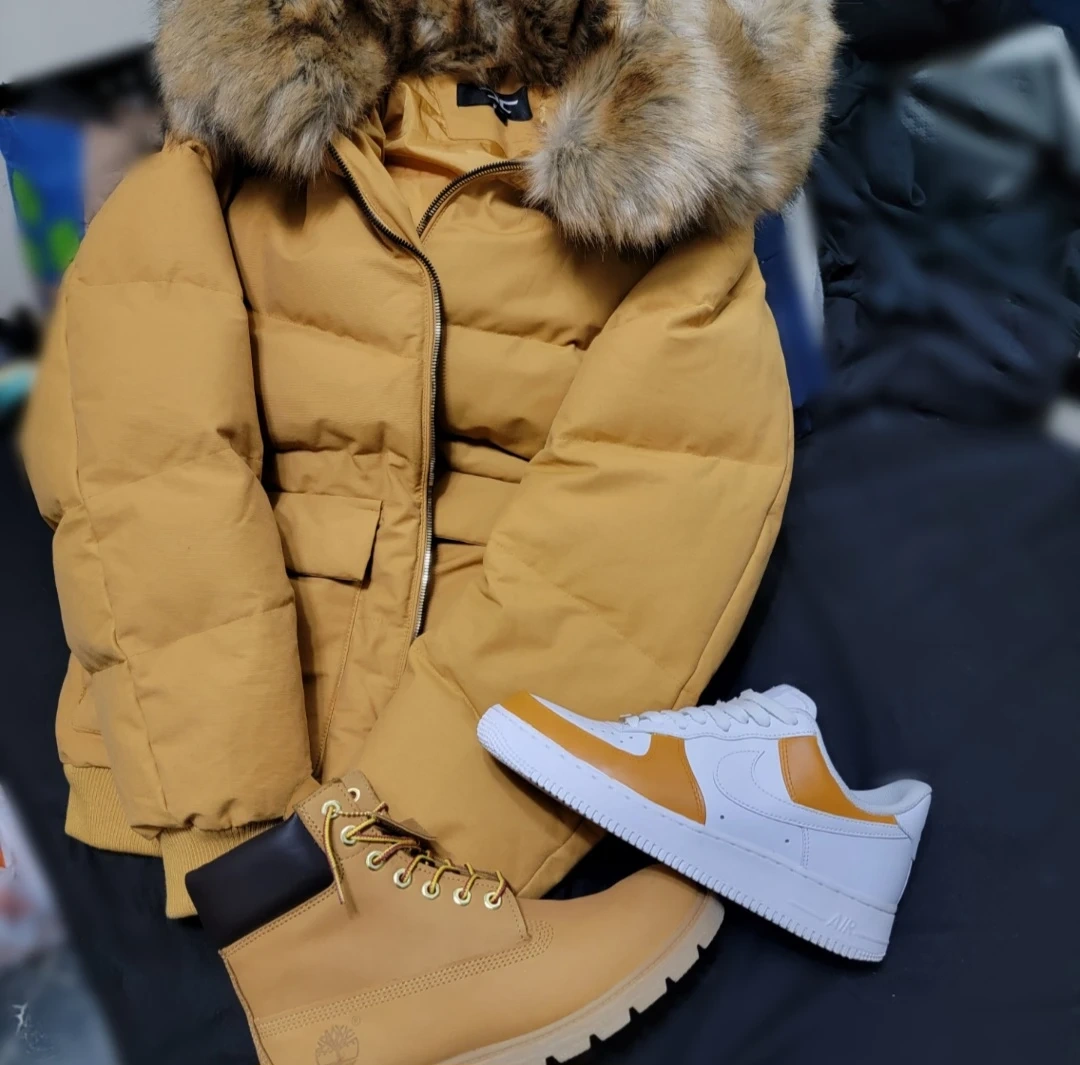 Here's a stylish puffer jacket with a fur-trimmed hood, perfect for staying warm and fashionable!