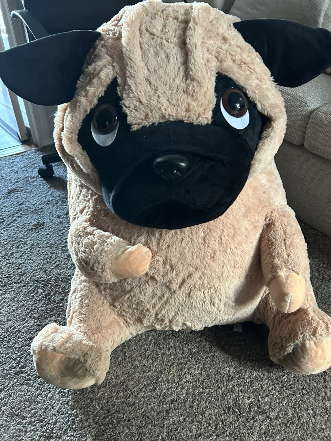 60This adorable pug dog plush toy is in like new condition! It's super soft and huggable. The tag indicates it's suitable for all ages and is also machine washable, making it easy to keep clean. Perfect for any dog lover!