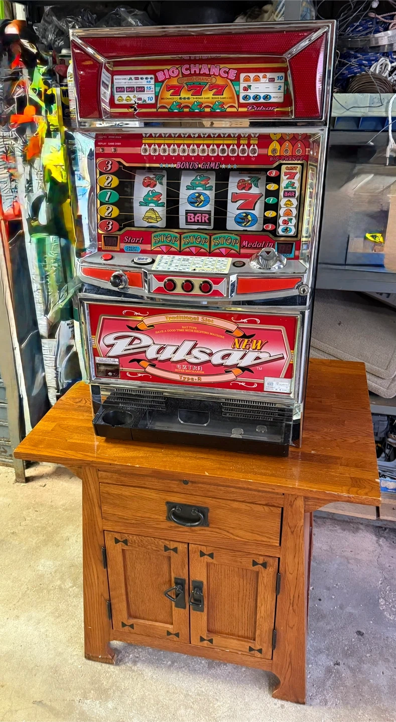 10Selling a vintage Pulsar pachislo slot machine! It's a fun piece for a game room or collector. The machine features classic reel symbols and lights. It's in good working condition