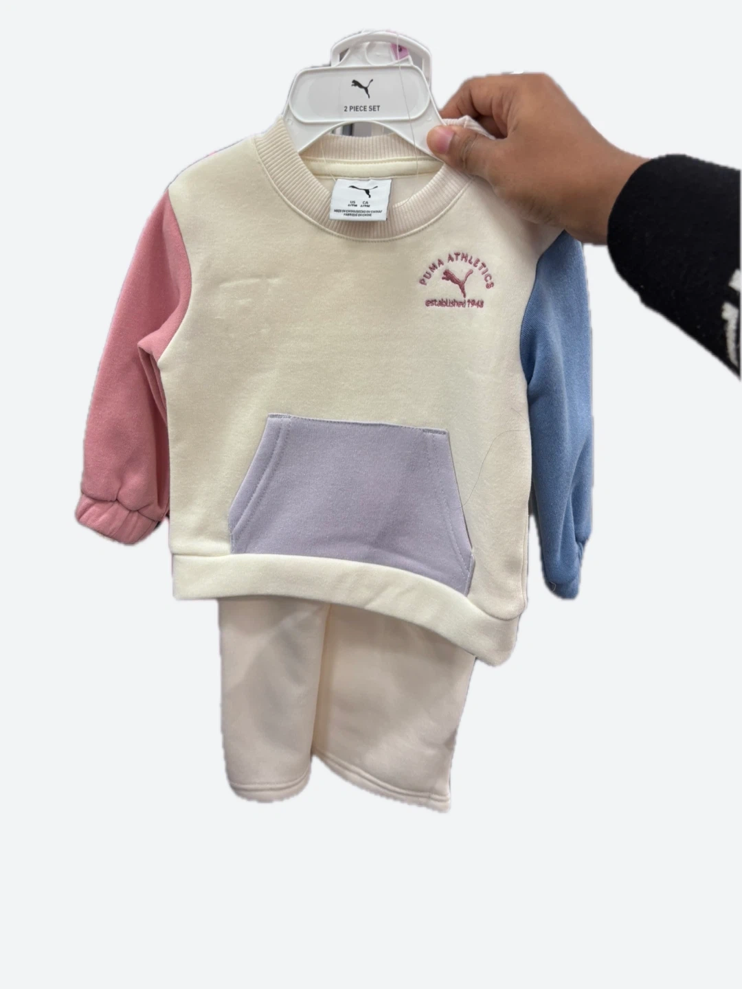 65This adorable Puma baby athletics set is perfect for your little one! The set includes a sweatshirt with a cute pocket and matching shorts. The sweatshirt features a stylish color-blocked design with pink, cream, and blue sleeves, and the Puma Athletics logo is embroidered on the front. It's a cozy and fashionable outfit for your baby!
