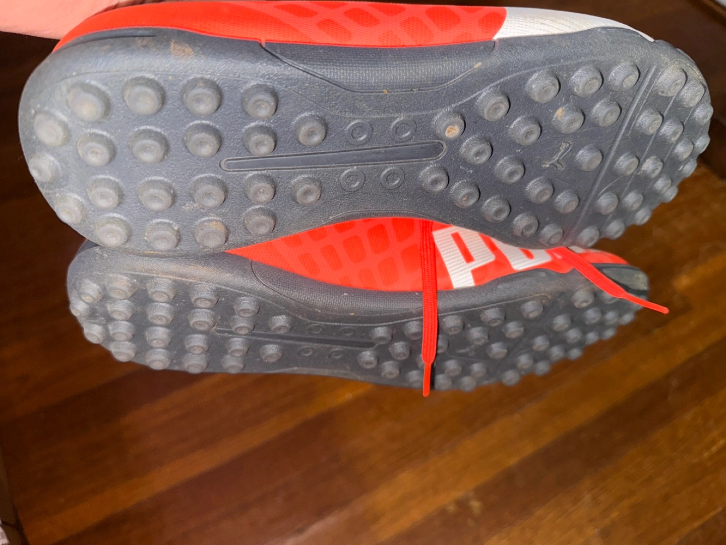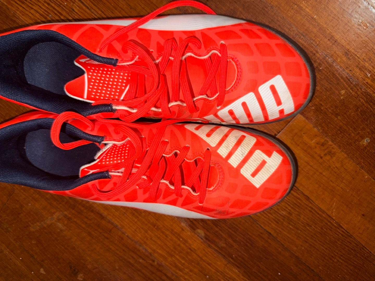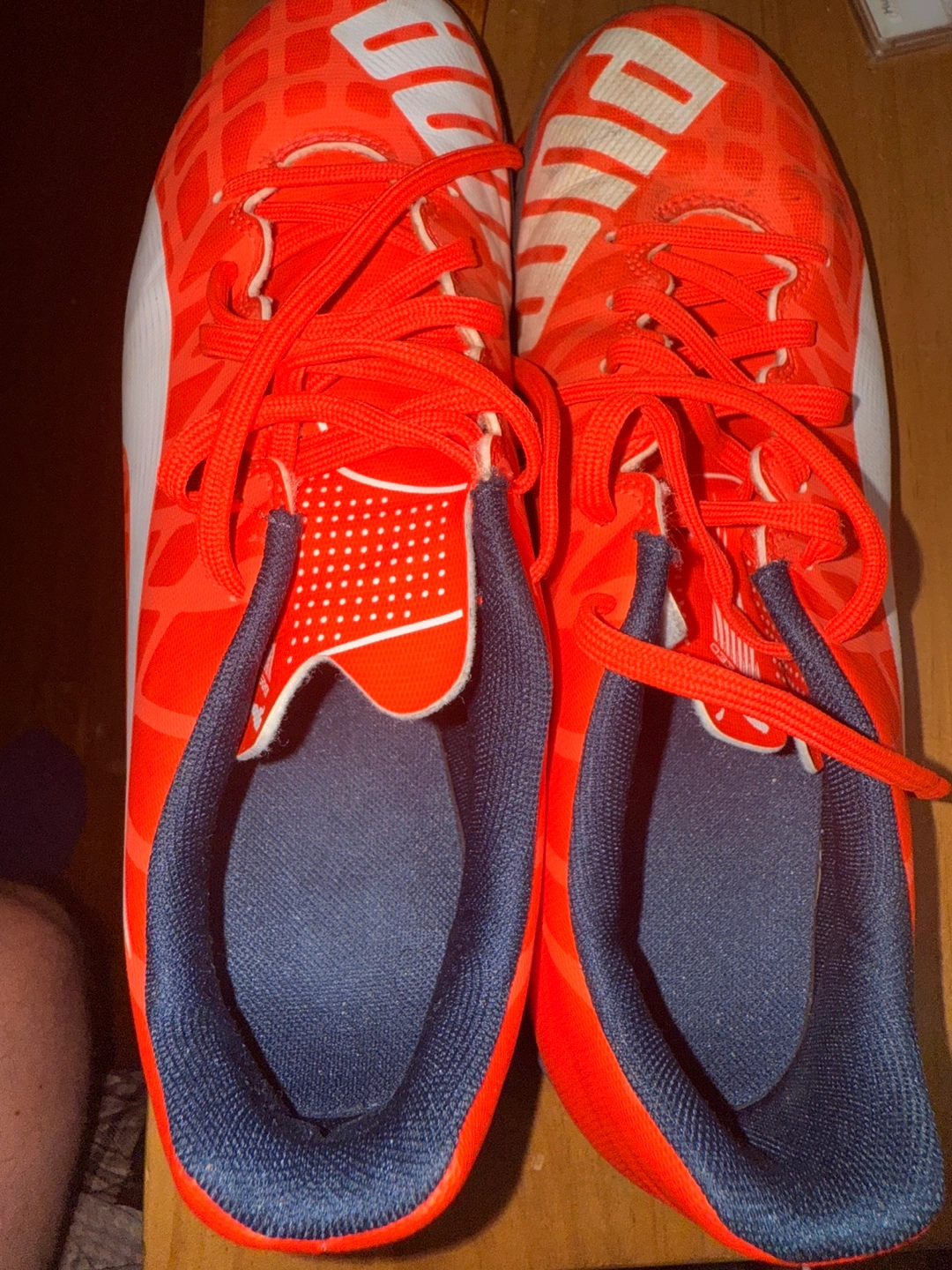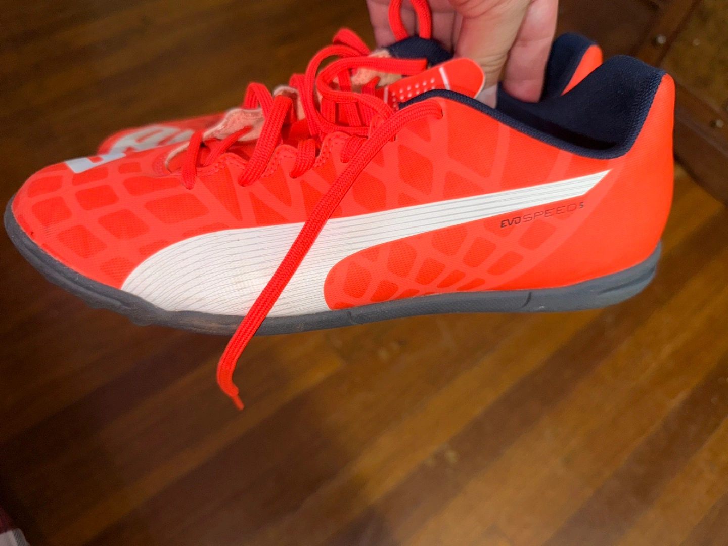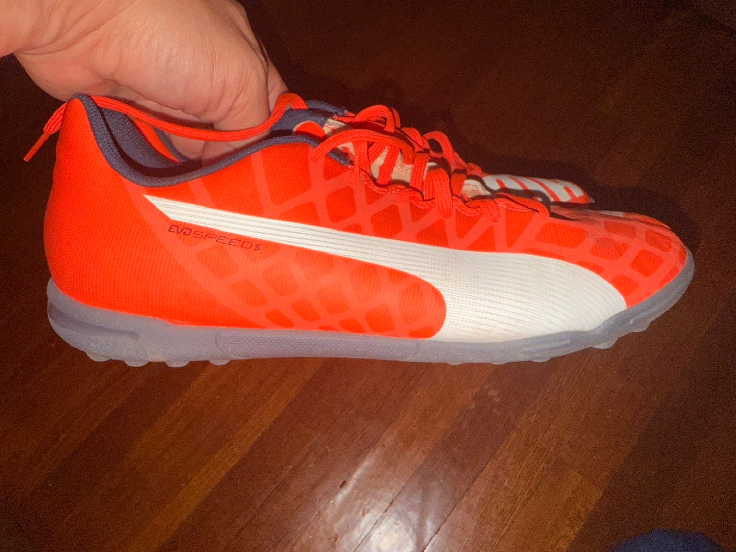 10Selling a pair of Puma EvoSpeed soccer shoes. They're orange with a white stripe Great for indoor or turf play!