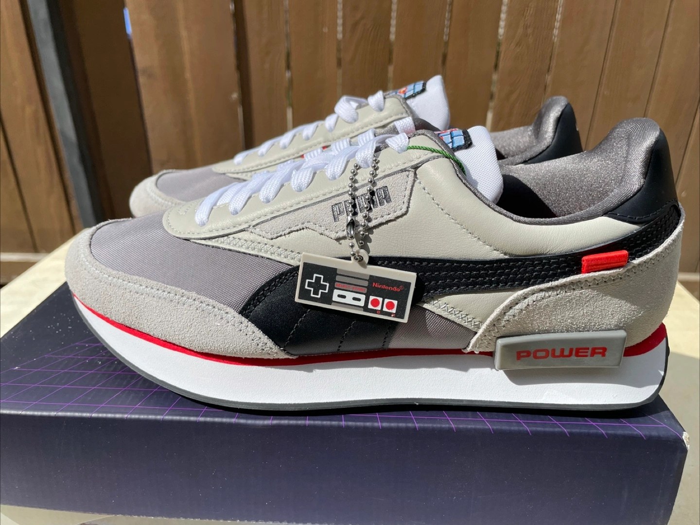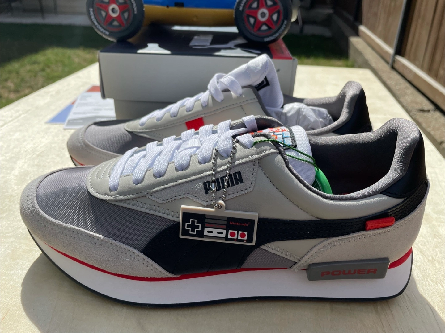 Get ready to power up your style with these Puma Future Rider Nintendo sneakers! These cool kicks feature a retro Nintendo design that's sure to turn heads. They're in great condition and ready for a new adventure. Perfect for gamers and sneakerheads alike!