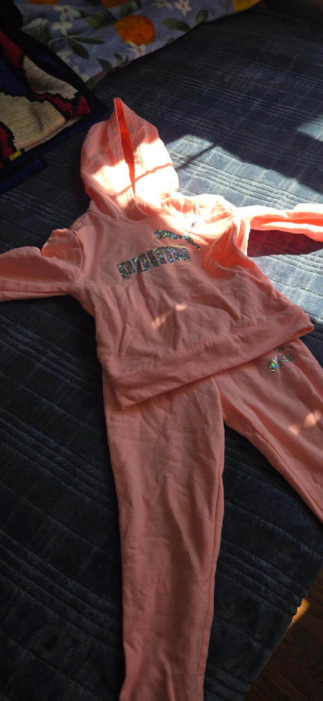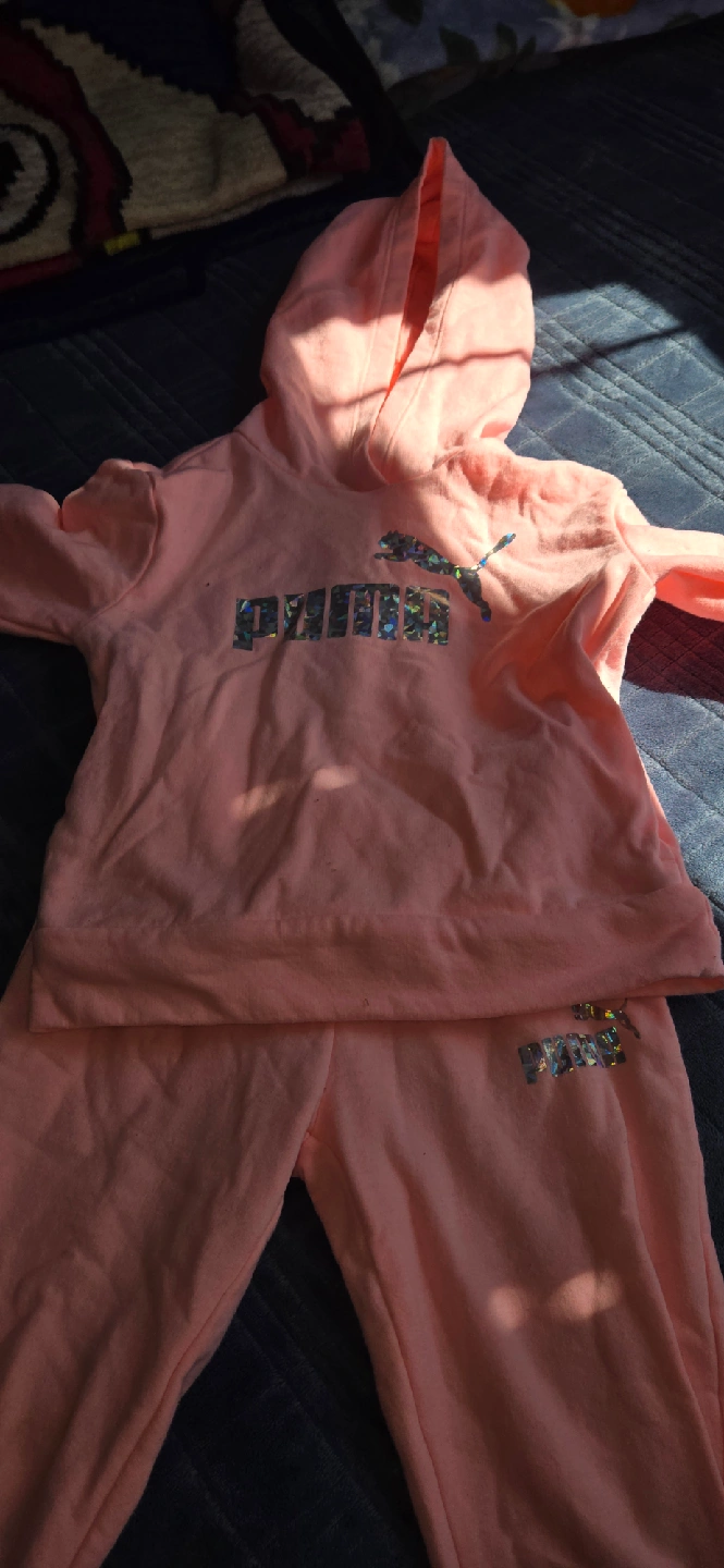 Selling a cute Puma tracksuit for kids! It's a soft peach color and features the Puma logo on both the hoodie and pants. Perfect for keeping your little one comfy and stylish. size 4T.
