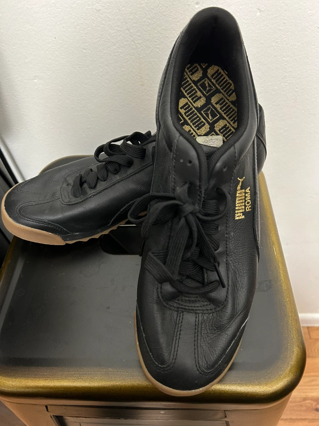 60Selling a pair of Puma Roma sneakers in black leather. They are in good condition and have a classic look. The sole is a gum color. Size: 10