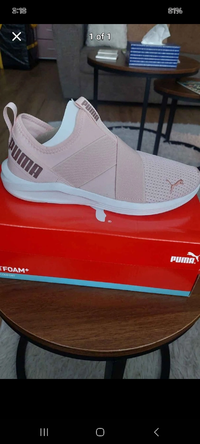 These Puma slip-on shoes are in great condition and come with the original box! They're a lovely shade of pink and feature a comfortable, easy-to-wear design. Perfect for everyday wear or light workouts