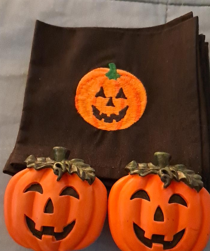 I have a set of black napkins with an embroidered pumpkin design. They come with two pumpkin-shaped napkin holders. Perfect for adding a festive touch to your Halloween or fall-themed table setting!