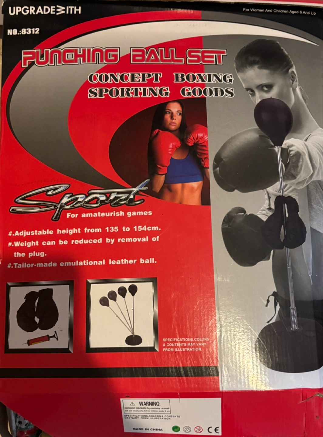 Concept Boxing sporting goods. Adjustable height from 135 to 154cm. Weight reduction by plug removal. Includes tailor-made emulational leather ball and gloves. For amateur games. For women and children aged 6 and up.