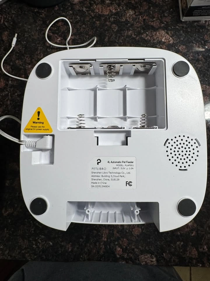 Scheduled automatic feeding. Ensure your pet eats regularly and healthily with PetLibro's automatic pet feeder. Featuring a built-in LCD screen, you can easily set up and schedule feedings according to your pet's needs, even when you're away for work. You can record a 10-second message and play it (up to five times) to get your pet to eat while you're away. Use the DC 5V adapter to power the timed cat feeder. Alternatively, install three backup alkaline D batteries (not included) for peace of mind during a power outage. PetLibro has redesigned the inclination angle of the food bowl and food outlet to make your pet's eating posture more comfortable and prevent clogging. The dispenser has a secure top lid that prevents your pet from accessing the food and keeps air out to maintain freshness. Includes a replaceable desiccant bag. Stainless steel bowl to prevent pets from chin acne. Dry pet food only. Works best with dry kibble sized 2-10mm.