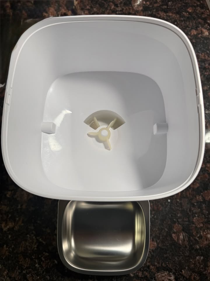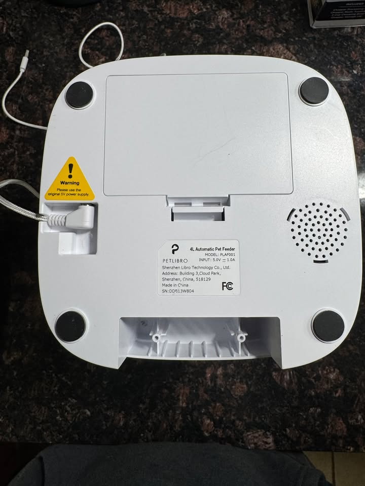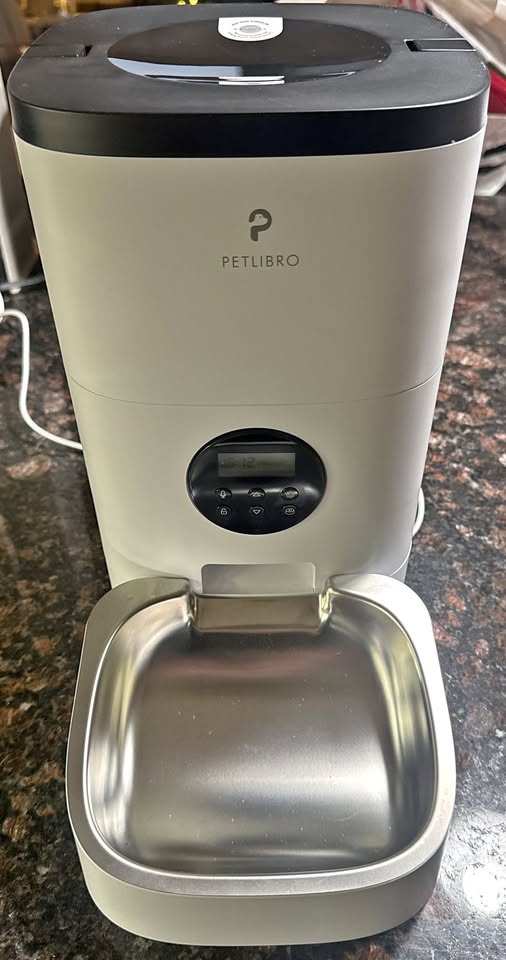 Scheduled automatic feeding. Ensure your pet eats regularly and healthily with PetLibro's automatic pet feeder. Featuring a built-in LCD screen, you can easily set up and schedule feedings according to your pet's needs, even when you're away for work. You can record a 10-second message and play it (up to five times) to get your pet to eat while you're away. Use the DC 5V adapter to power the timed cat feeder. Alternatively, install three backup alkaline D batteries (not included) for peace of mind during a power outage. PetLibro has redesigned the inclination angle of the food bowl and food outlet to make your pet's eating posture more comfortable and prevent clogging. The dispenser has a secure top lid that prevents your pet from accessing the food and keeps air out to maintain freshness. Includes a replaceable desiccant bag. Stainless steel bowl to prevent pets from chin acne. Dry pet food only. Works best with dry kibble sized 2-10mm.