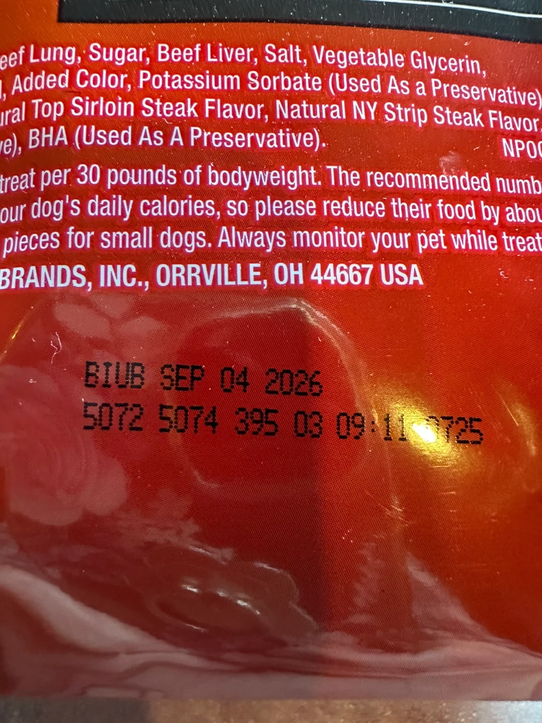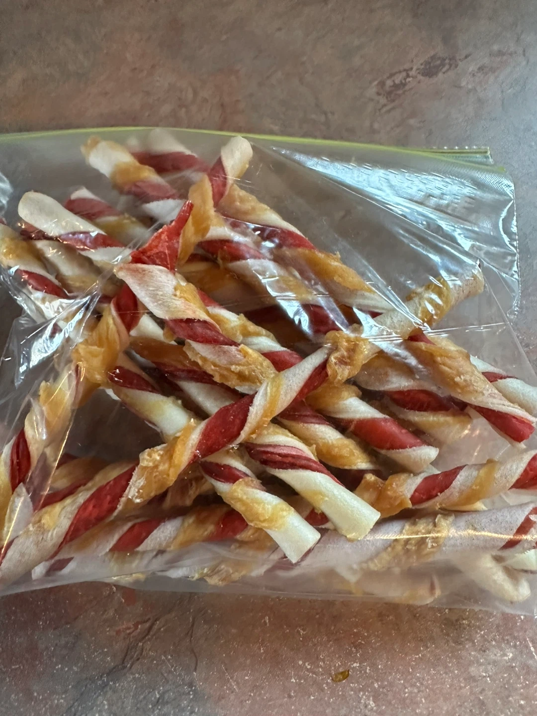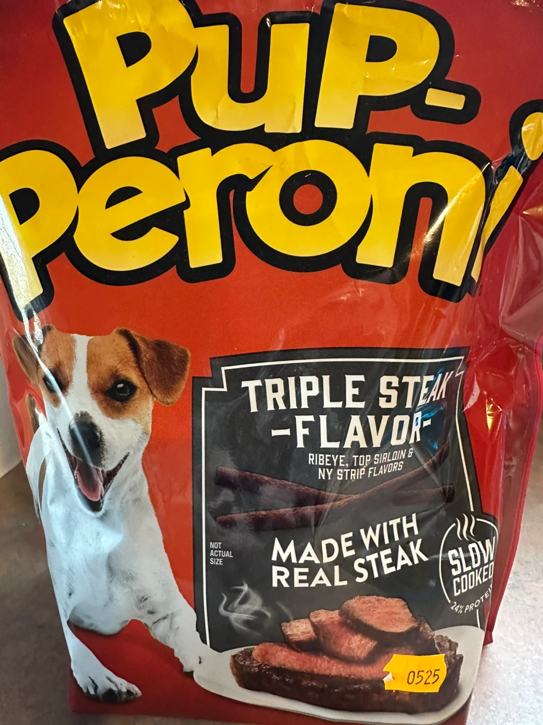 Pup-Peroni Triple Steak Flavor dog treats for your furry friend! These treats are made with real steak and slow-cooked for a delicious taste and aroma. They're perfect for small dogs, and the bag has an expiration date of 2026 September 04 Was opened and only one taken out. Plus a bag of chicken flavored NO RAWHIDE stick treats.