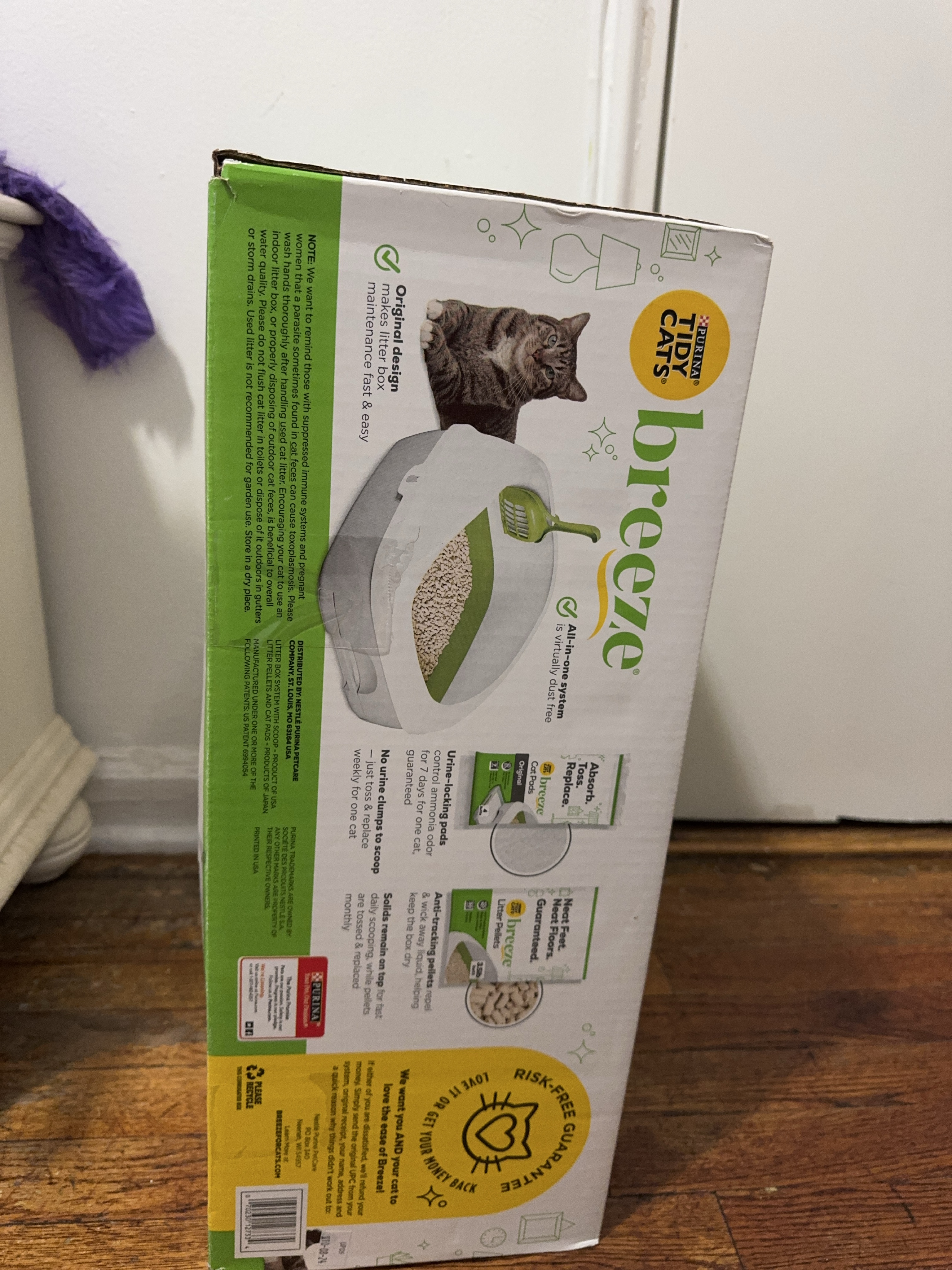 60Selling a Purina Tidy Cats Breeze litter box system! It's designed to make litter box maintenance fast and easy. The all-in-one system is virtually dust-free, and the urine-locking pads control ammonia odor for 7 days for one cat. No urine clumps to scoop - just toss & replace weekly for one cat! The anti-tracking pellets repel & wick away liquid, helping keep the box dry