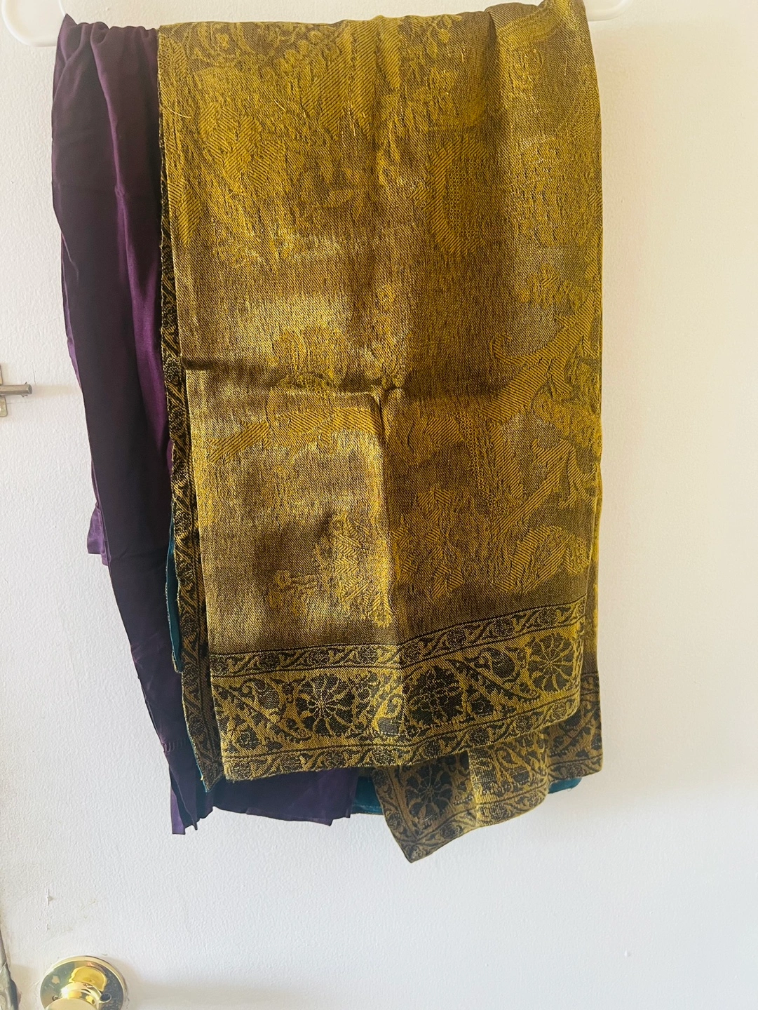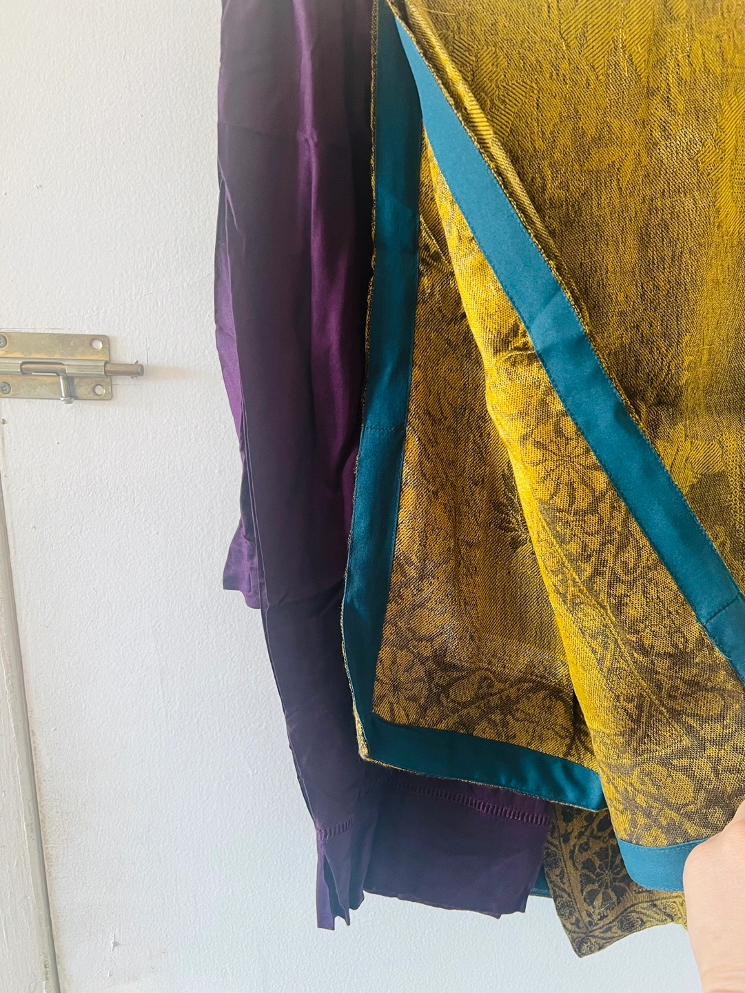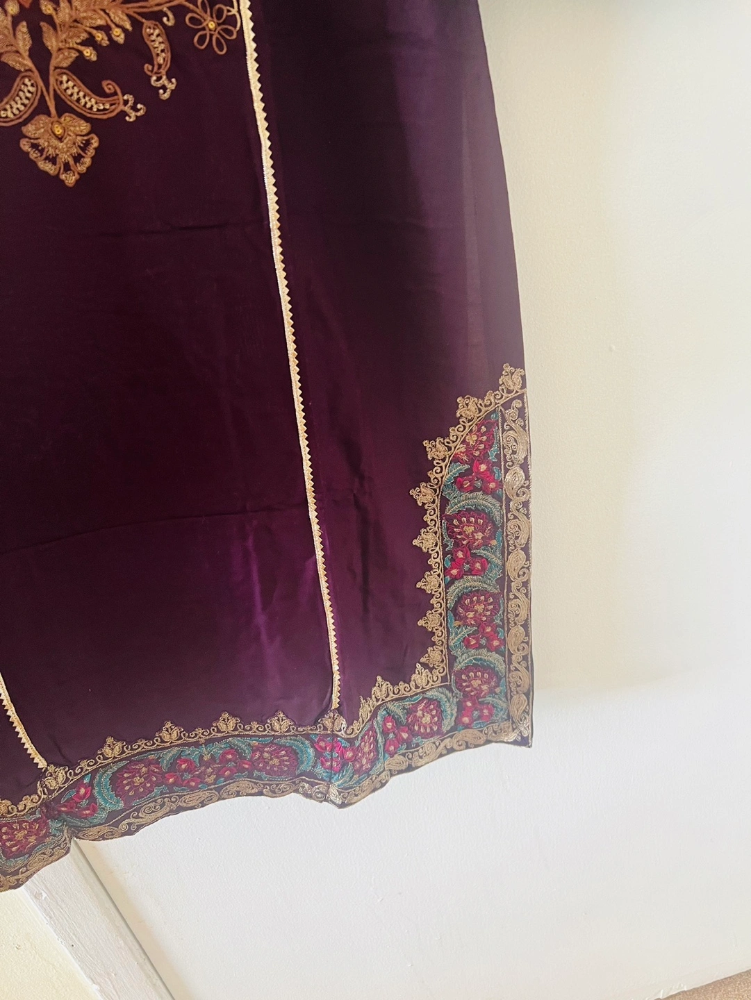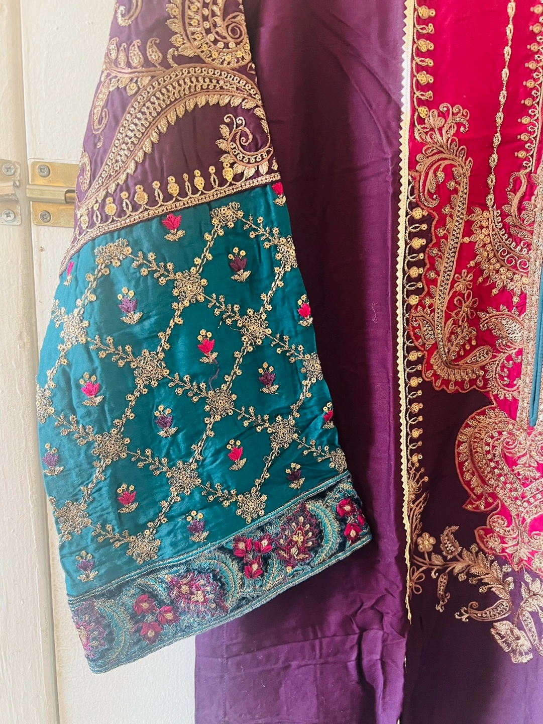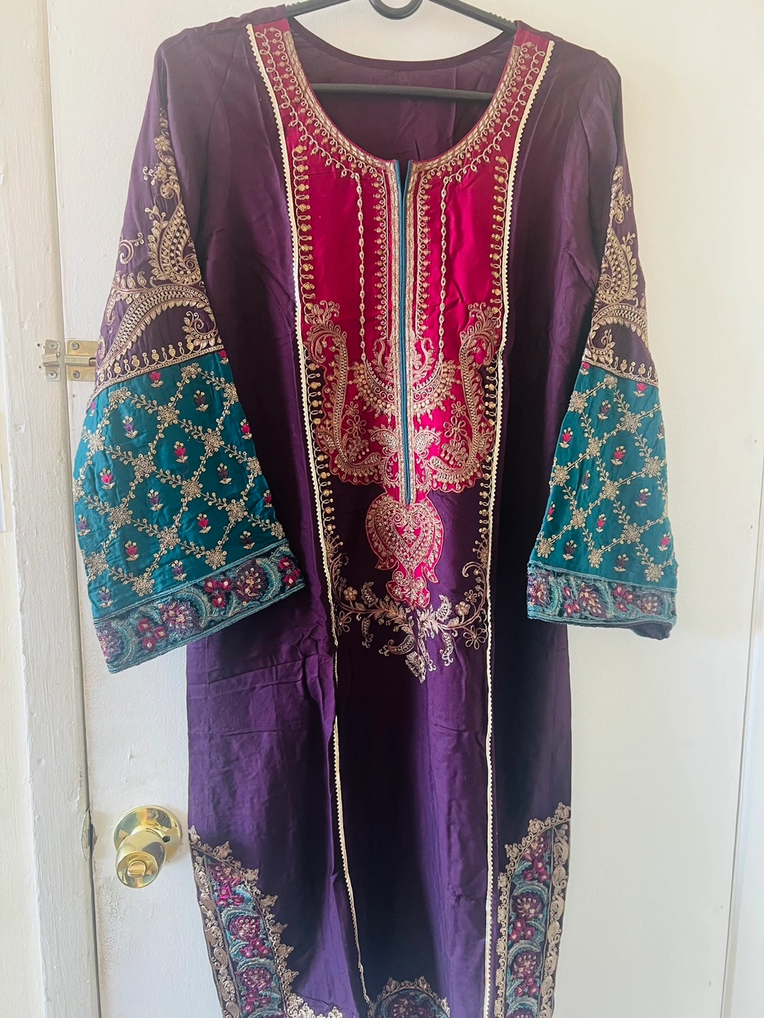 Beautiful purple and gold Pakistani suit with dupatta. Embroidered with gold and red thread. Has a teal green trim on the sleeves and bottom.