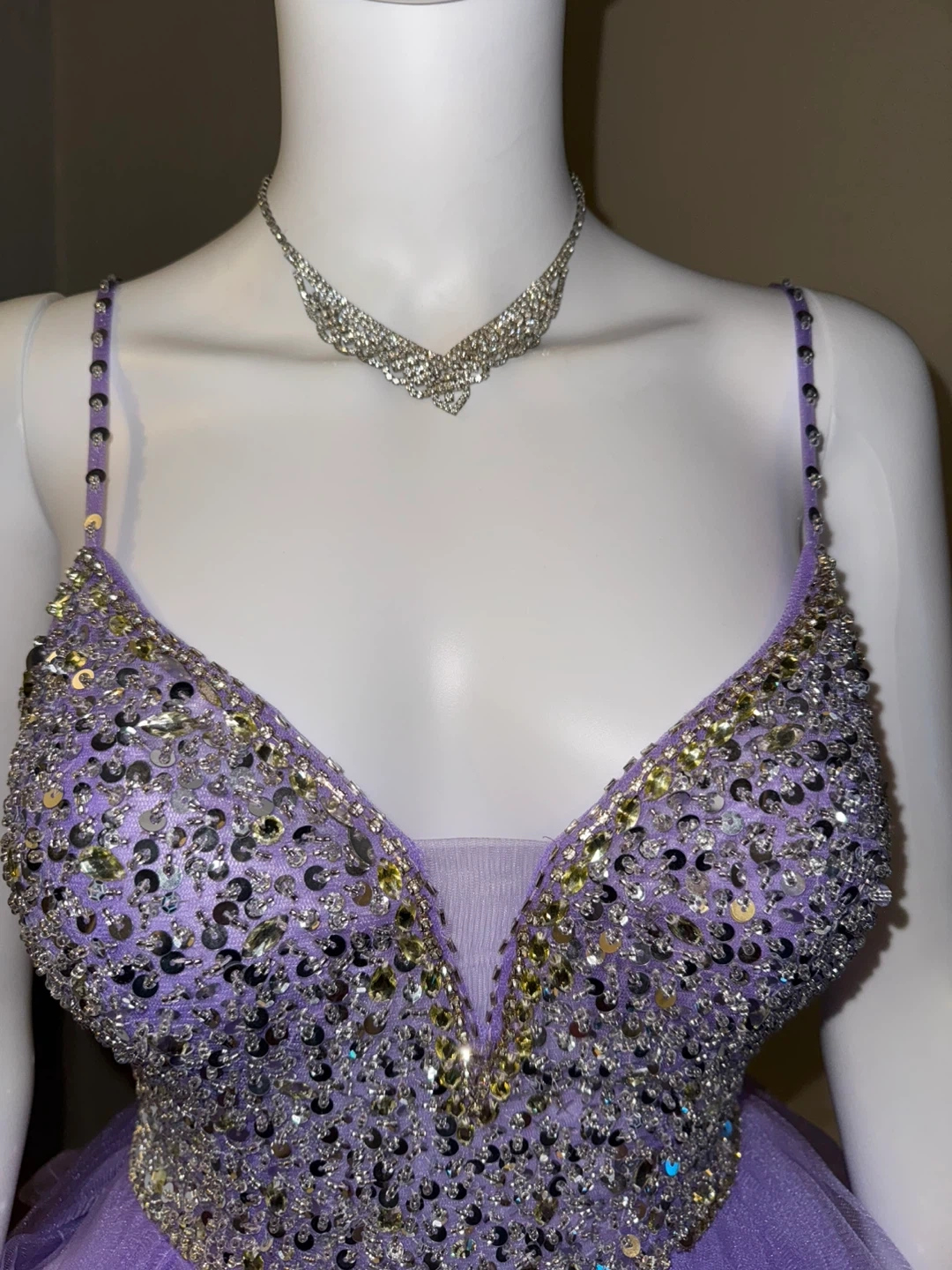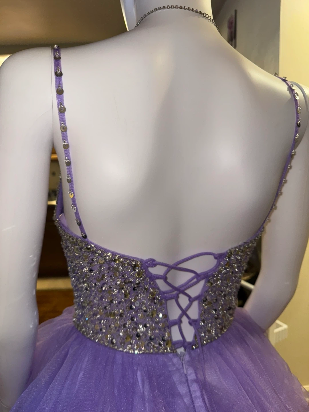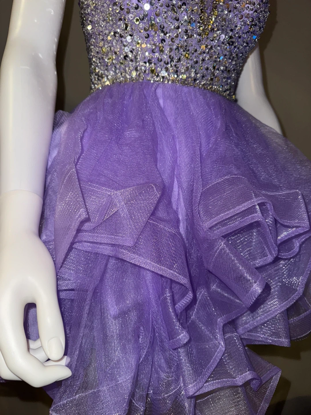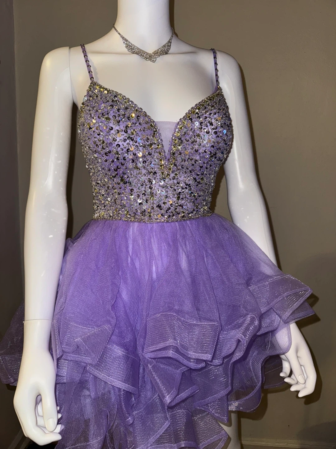 Selling a beautiful purple party dress with beaded detailing. It features a v-neck and a layered skirt. Perfect for a special occasion!
