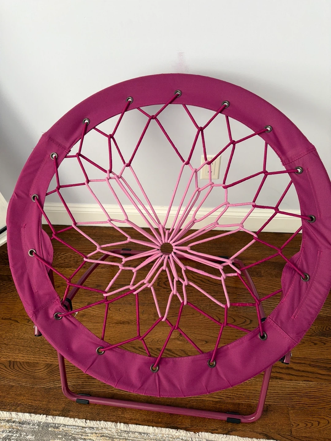 60Selling a fun and comfy purple bungee chair! It's in great condition and perfect for adding a pop of color to any room. The unique bungee design provides a comfortable and supportive seat, making it great for relaxing or studying. Get ready to lounge in style!