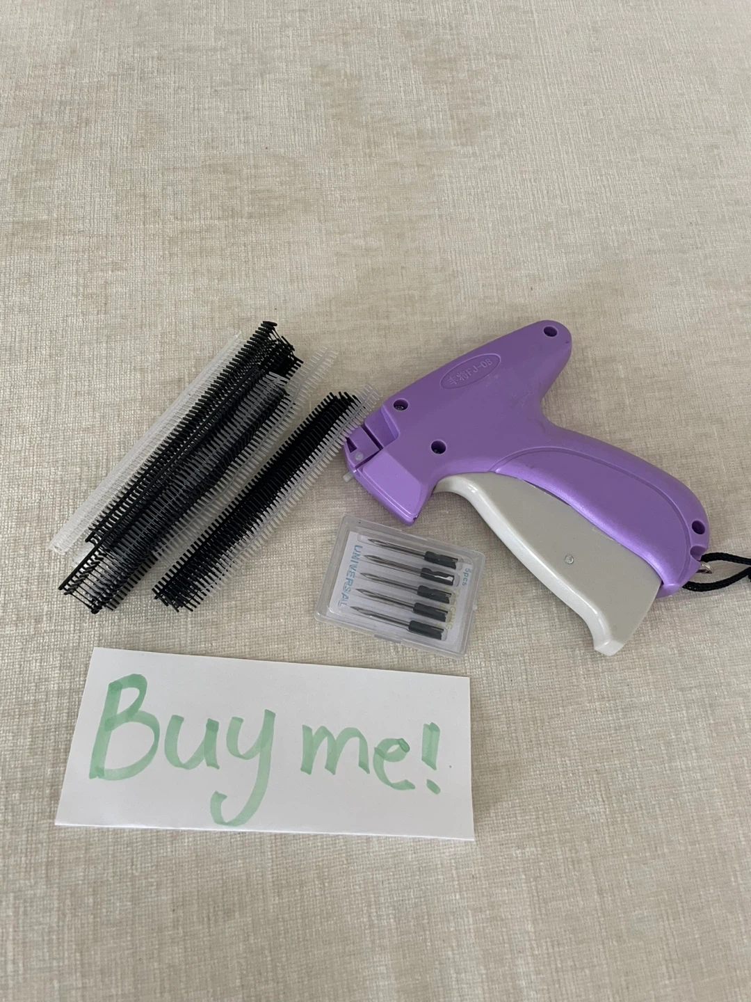 I'm selling a purple tagging gun! It comes with black and white barbs, as well as a pack of needles. Great for tagging items for sale or organizing your closet