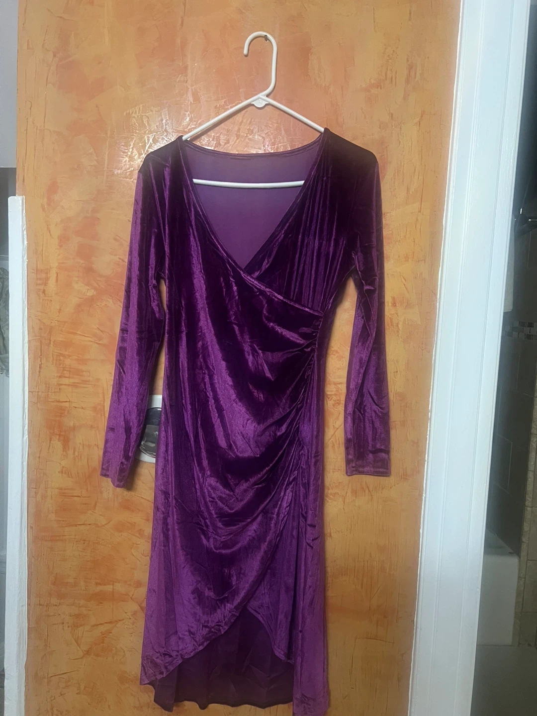 Here's a lovely purple velvet dress with long sleeves. It has a wrap style front and a draped design. Perfect for a night out or a special occasion!
