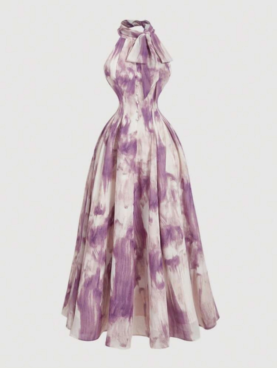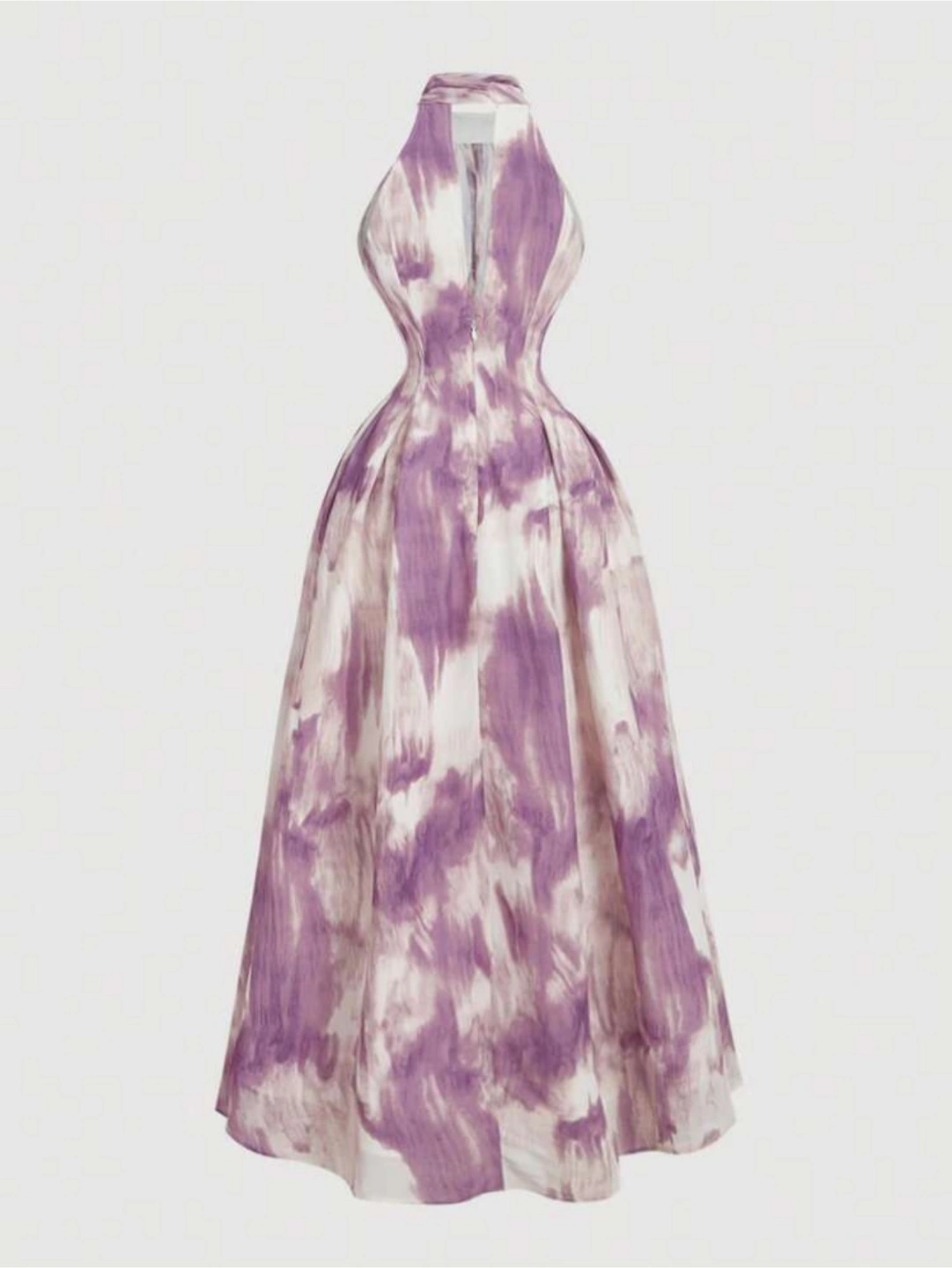 This is a beautiful halter neck dress with a unique purple and white pattern. It's perfect for a special occasion or a night out. The dress has a flattering silhouette and is made from a comfortable material. It features a halter neckline and a full skirt.