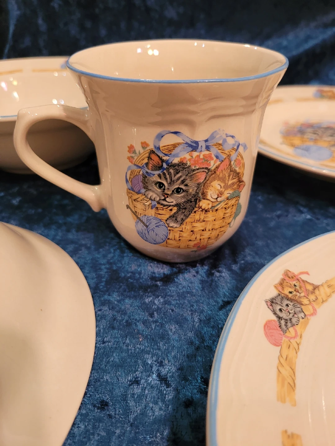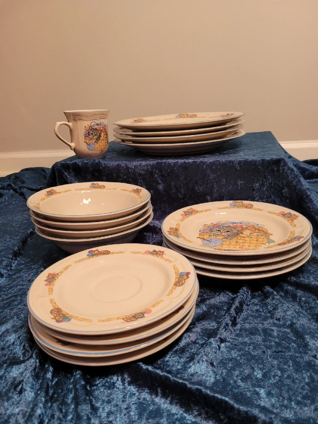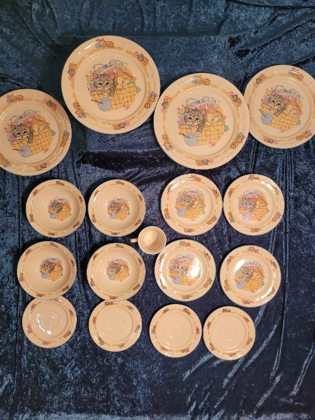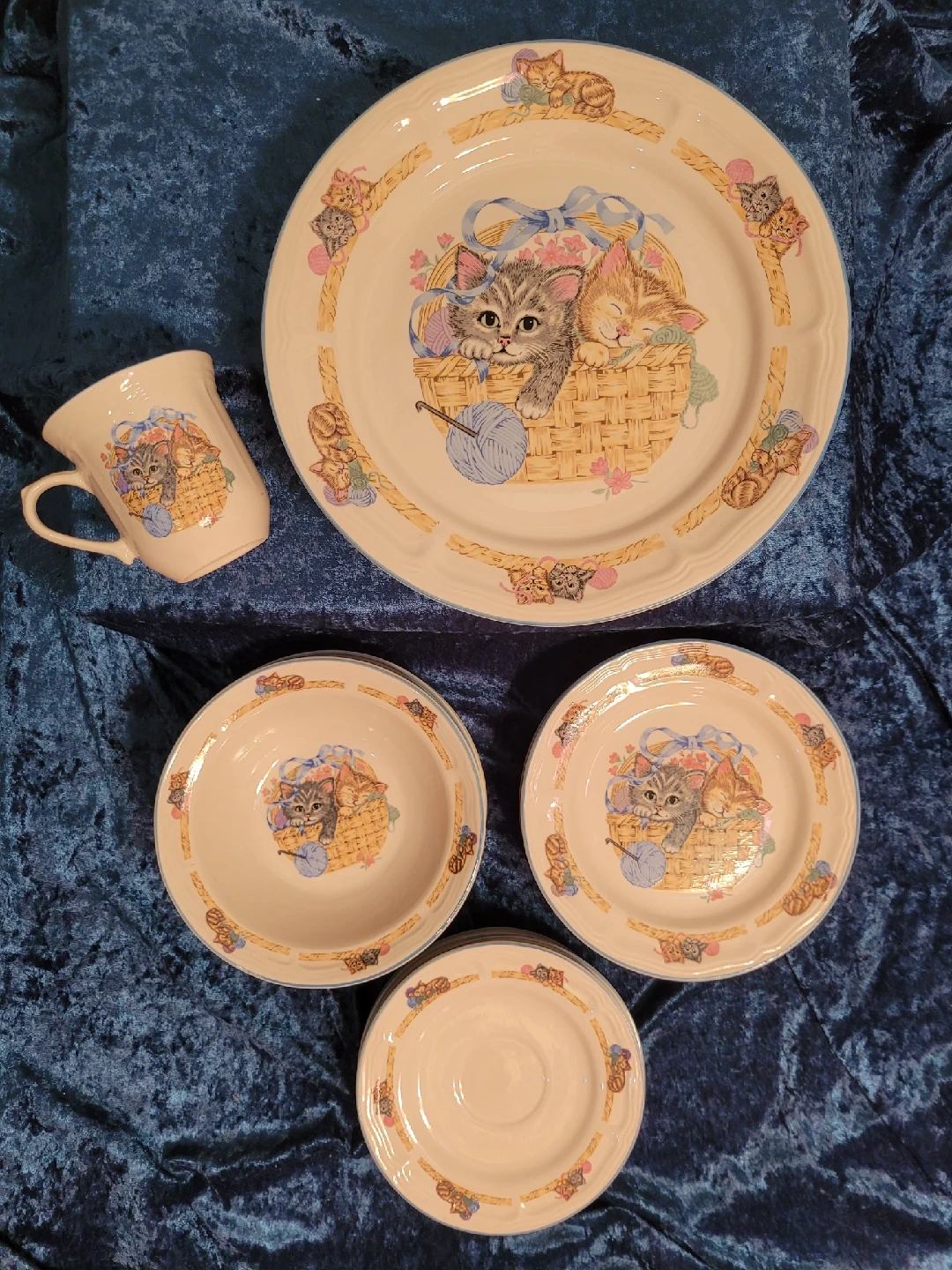 85I'm selling a vintage Purrfect Friends collection by Tienshan Stoneware dish set. The pieces are made of stoneware and are rated as oven-to-table, dishwasher, and microwave safe. The collection features a design of kittens in a basket playing with a ball of yarn. Good condition no cracks or chips. It's perfect for cat lovers! The set includes: 4 dinner plates - 10.5" 4 bread plates - 7.5" 4 bowls - 7" 4 saucers - 6 & 1/2" 1 mug - small Feel free to check out my other unique items listed
