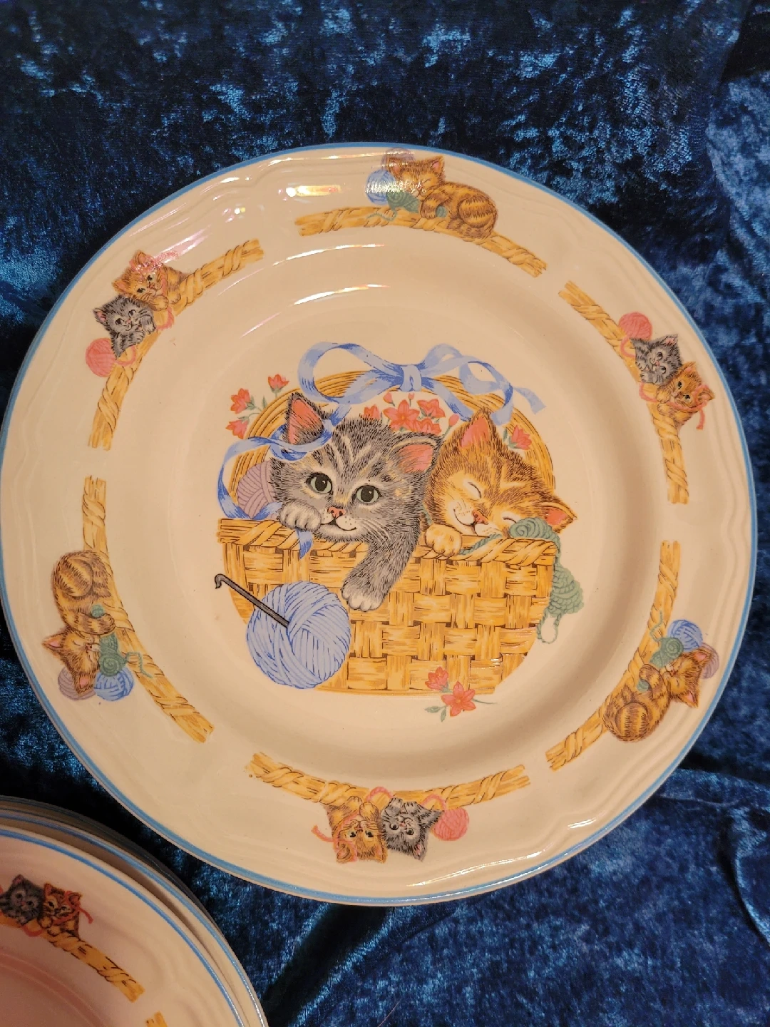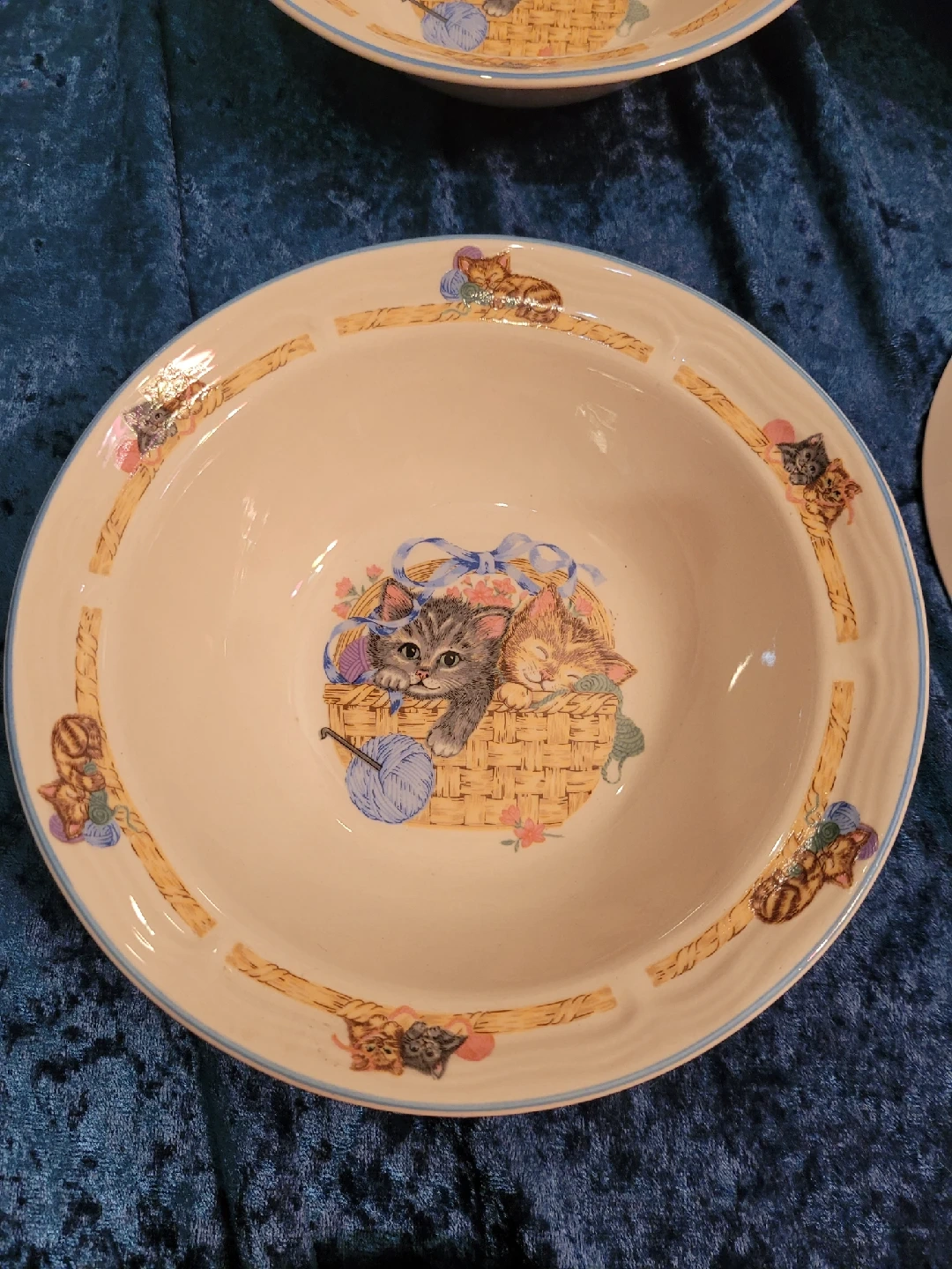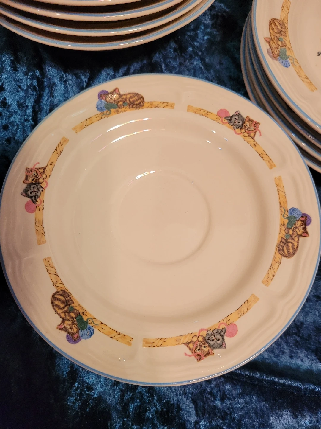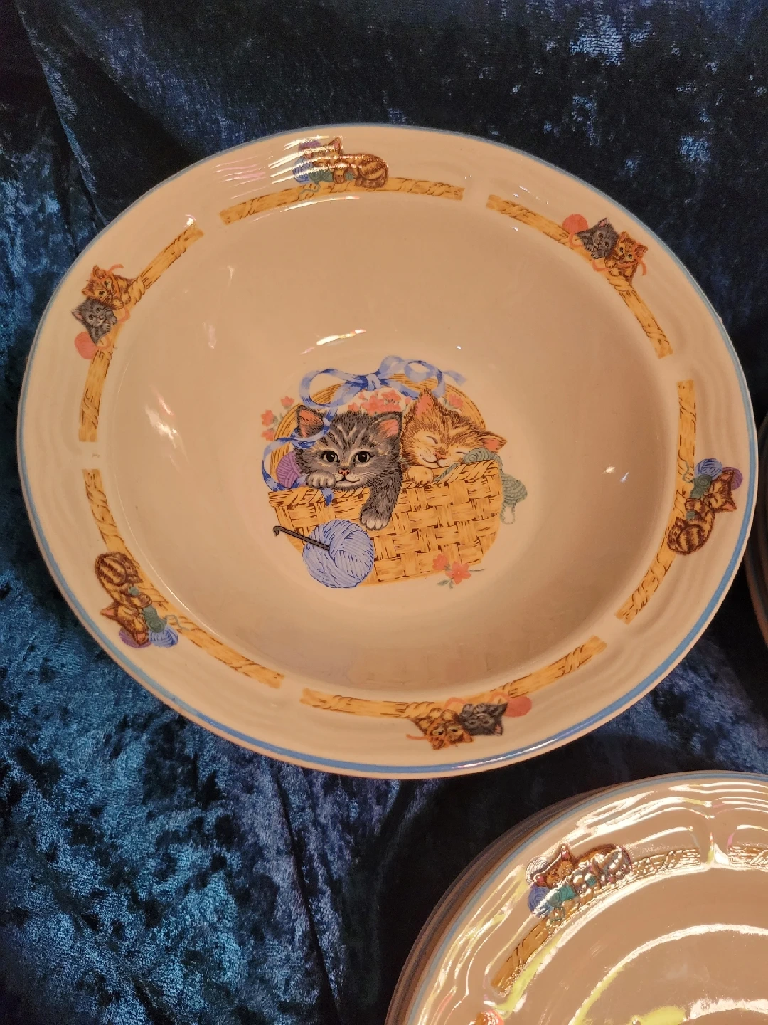 85I'm selling a vintage Purrfect Friends collection by Tienshan Stoneware dish set. The pieces are made of stoneware and are rated as oven-to-table, dishwasher, and microwave safe. The collection features a design of kittens in a basket playing with a ball of yarn. Good condition no cracks or chips. It's perfect for cat lovers! The set includes: 4 dinner plates - 10.5" 4 bread plates - 7.5" 4 bowls - 7" 4 saucers - 6 & 1/2" 1 mug - small Feel free to check out my other unique items listed