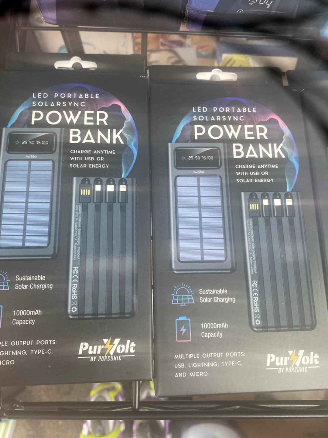 65Selling a Purvolt LED Portable SolarSync Power Bank! It has a 10000mAh capacity and can be charged with USB or solar energy. It features multiple output ports: USB, Lightning, Type-C, and Micro. Sustainable solar charging is also included