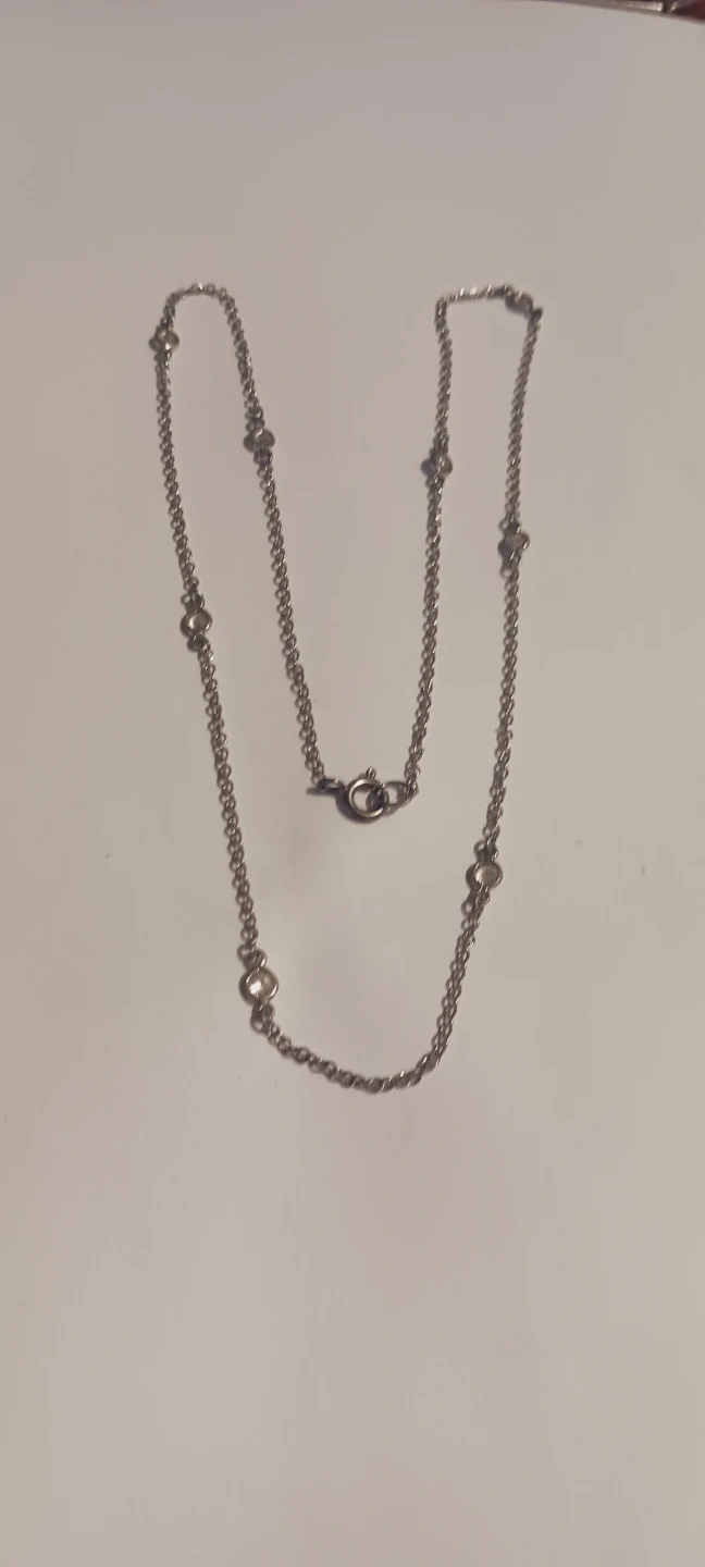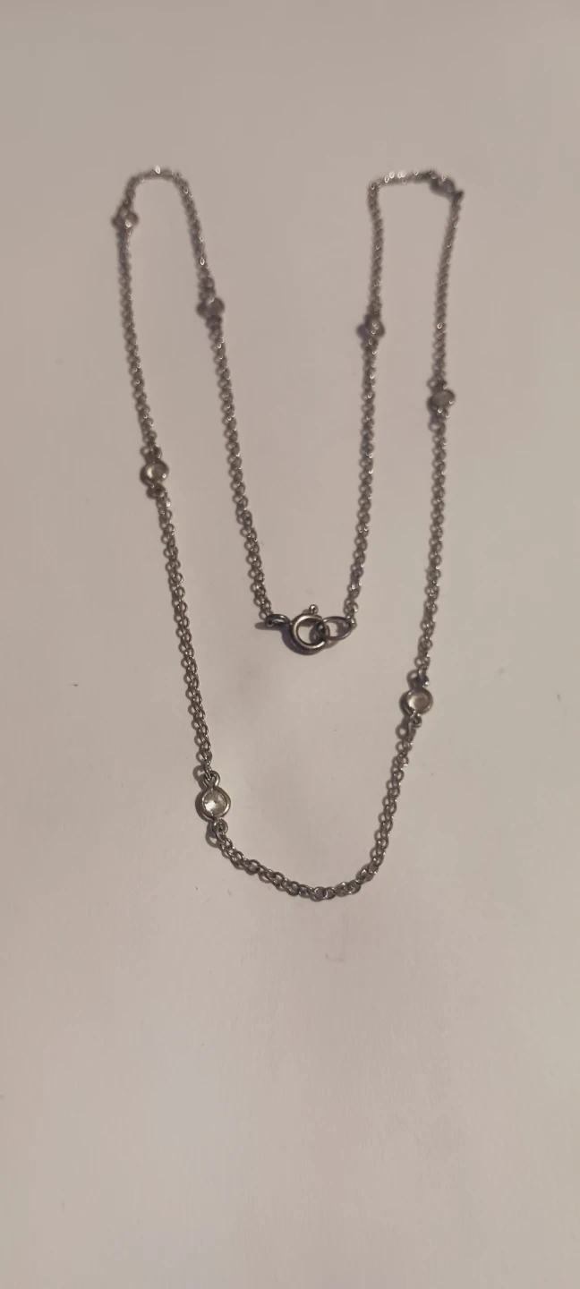 Sterling Silver 925 chain necklace featuring multiple clear stones spaced along the chain. It has a traditional clasp closure. This necklace's delicate design makes it suitable for everyday wear. 18" long. Excellent condition. It is stamped 925. ALL MY PRICES ARE NEGOTIABLE !!