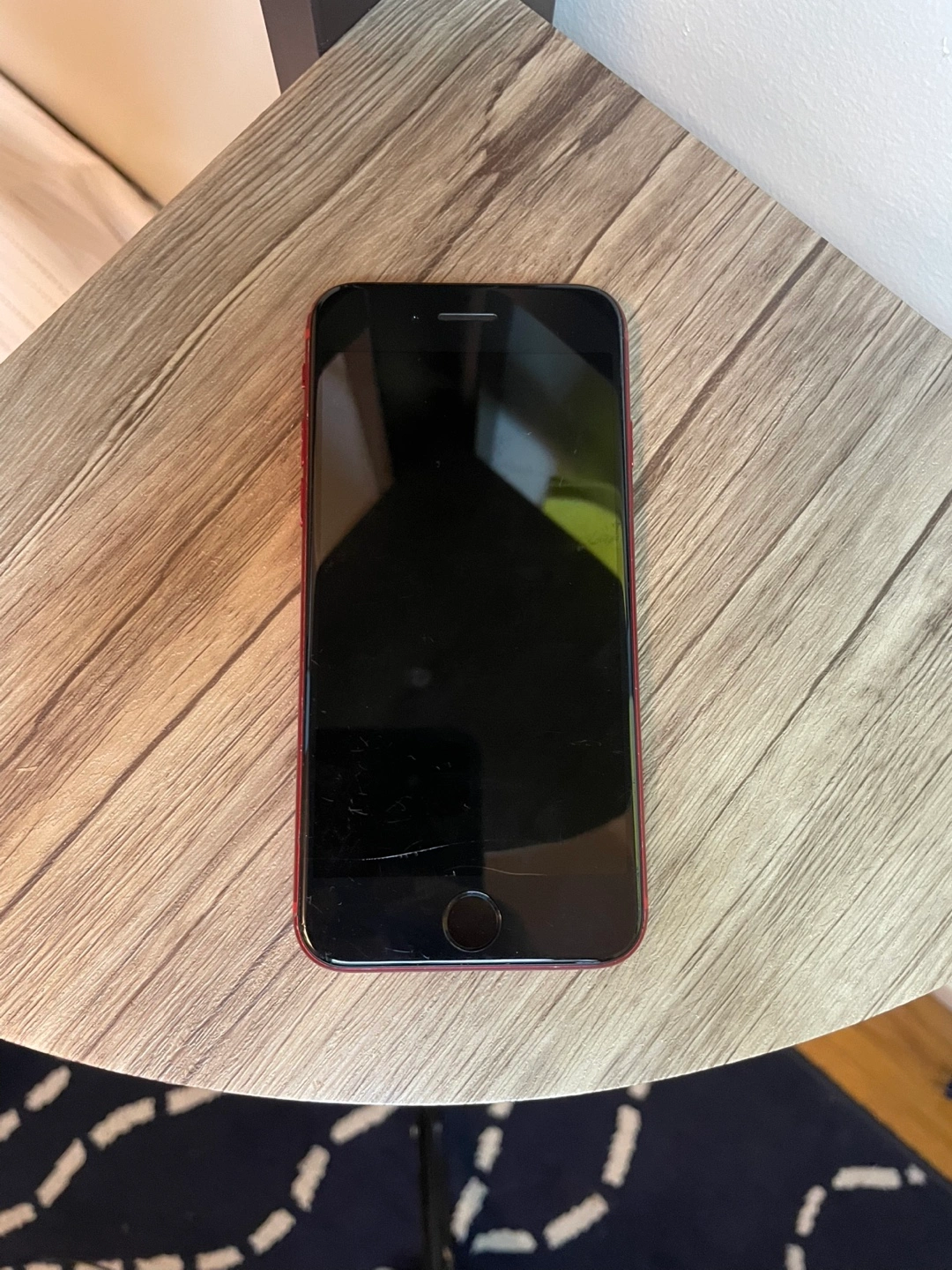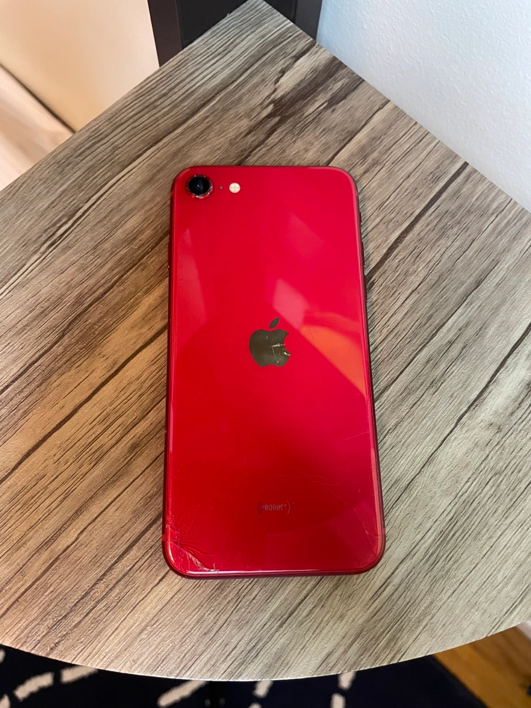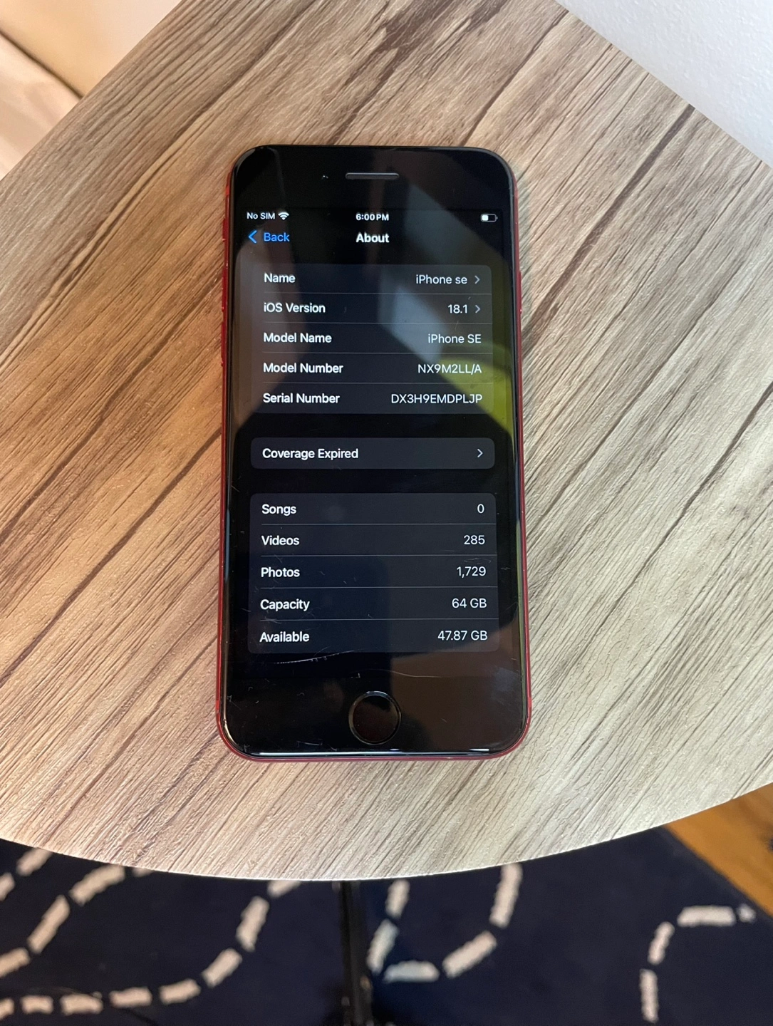 Red iPhone SE, 64GB, running iOS 18.1. Unlocked. Has minor cracks on the screen and the back glass. Carrier UNLOCKED