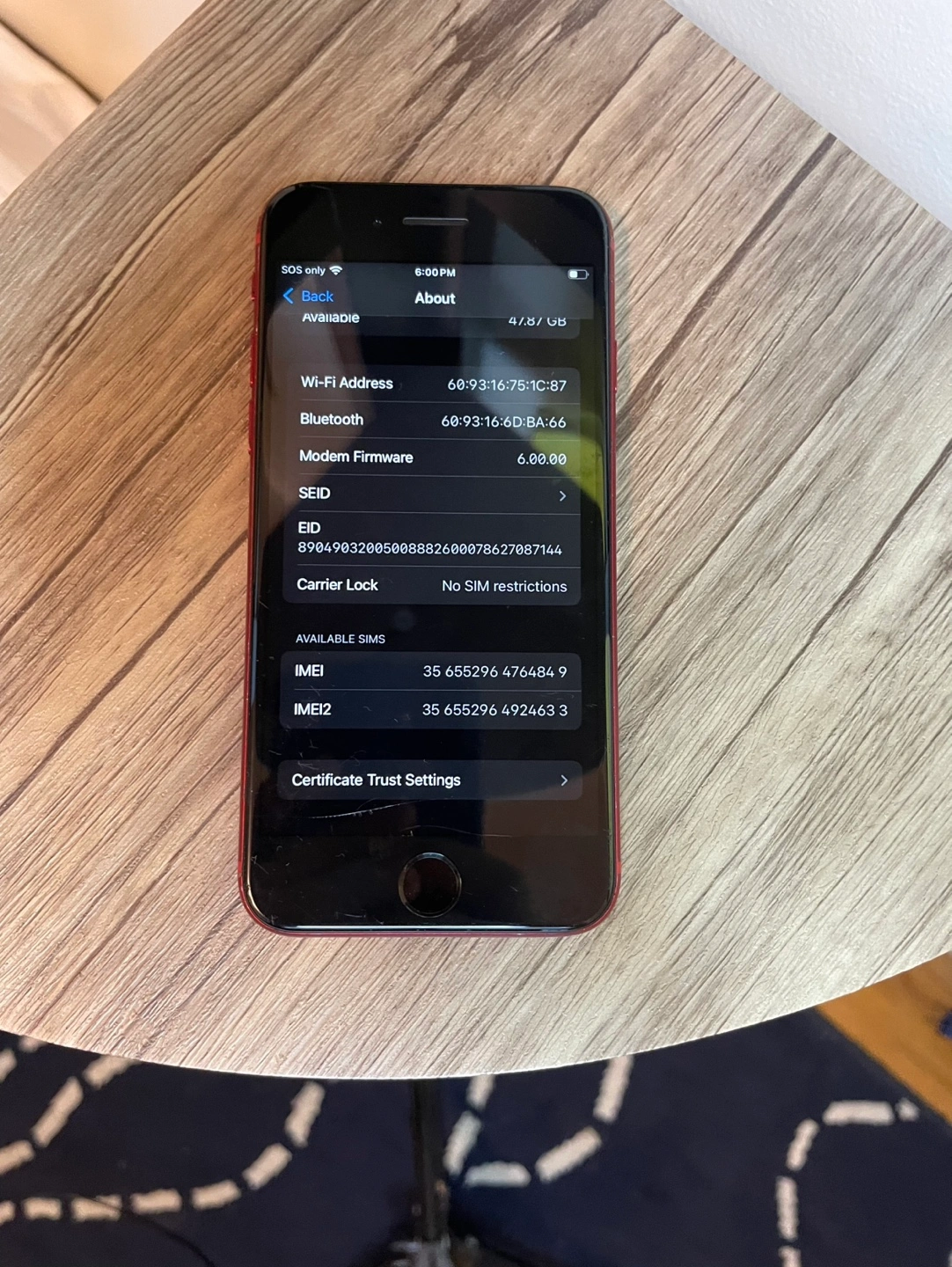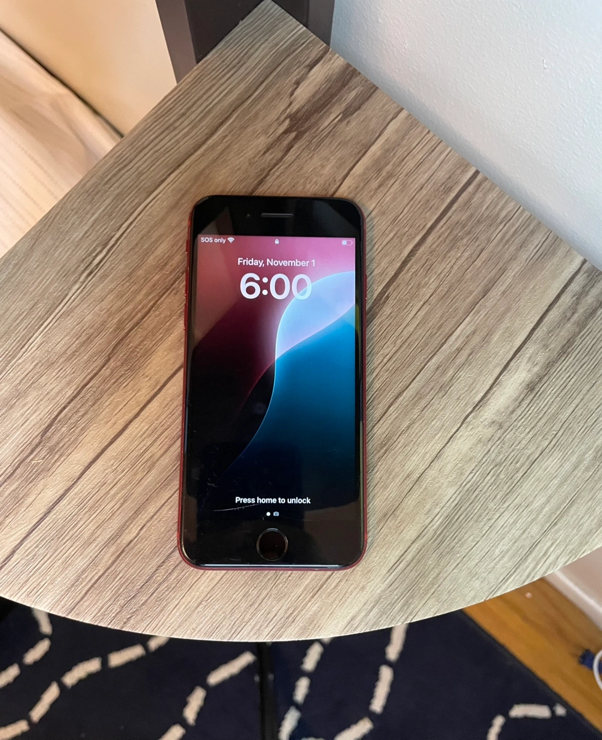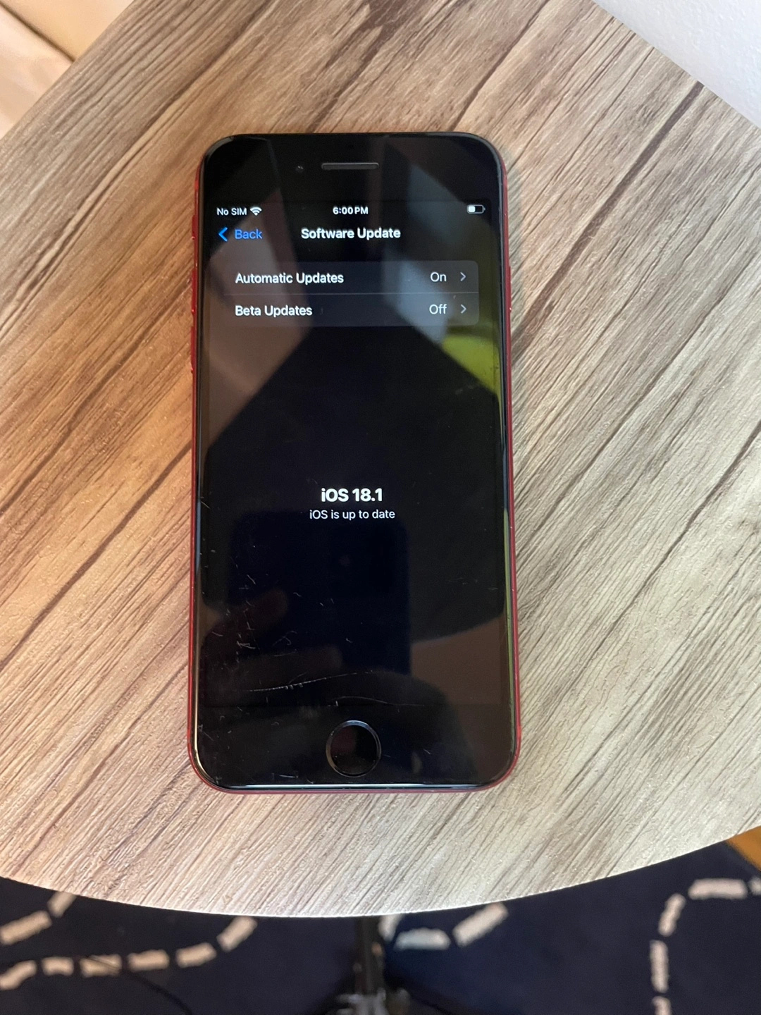 Red iPhone SE, 64GB, running iOS 18.1. Unlocked. Has minor cracks on the screen and the back glass. Carrier UNLOCKED