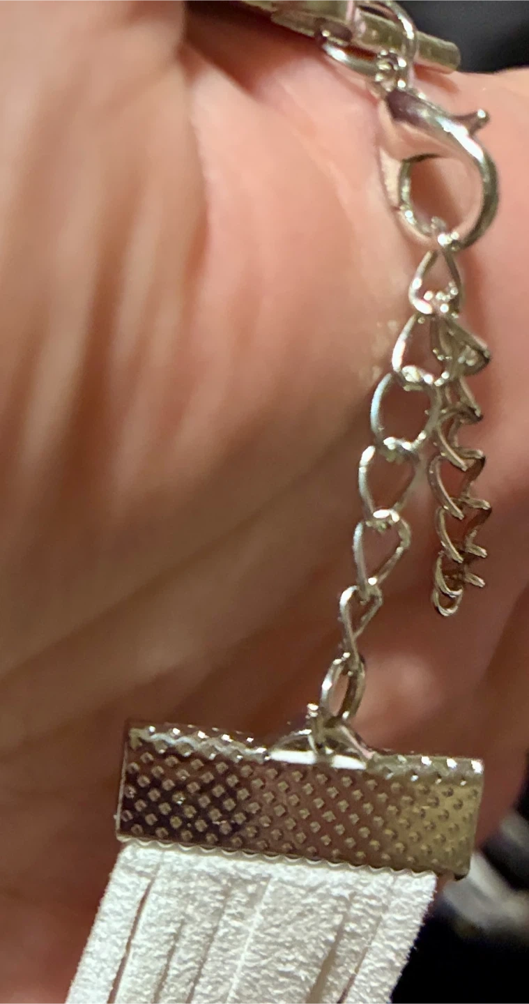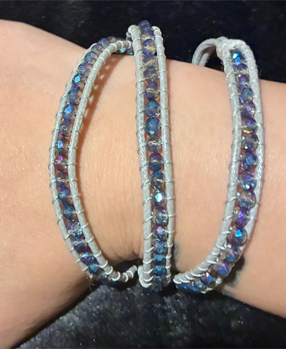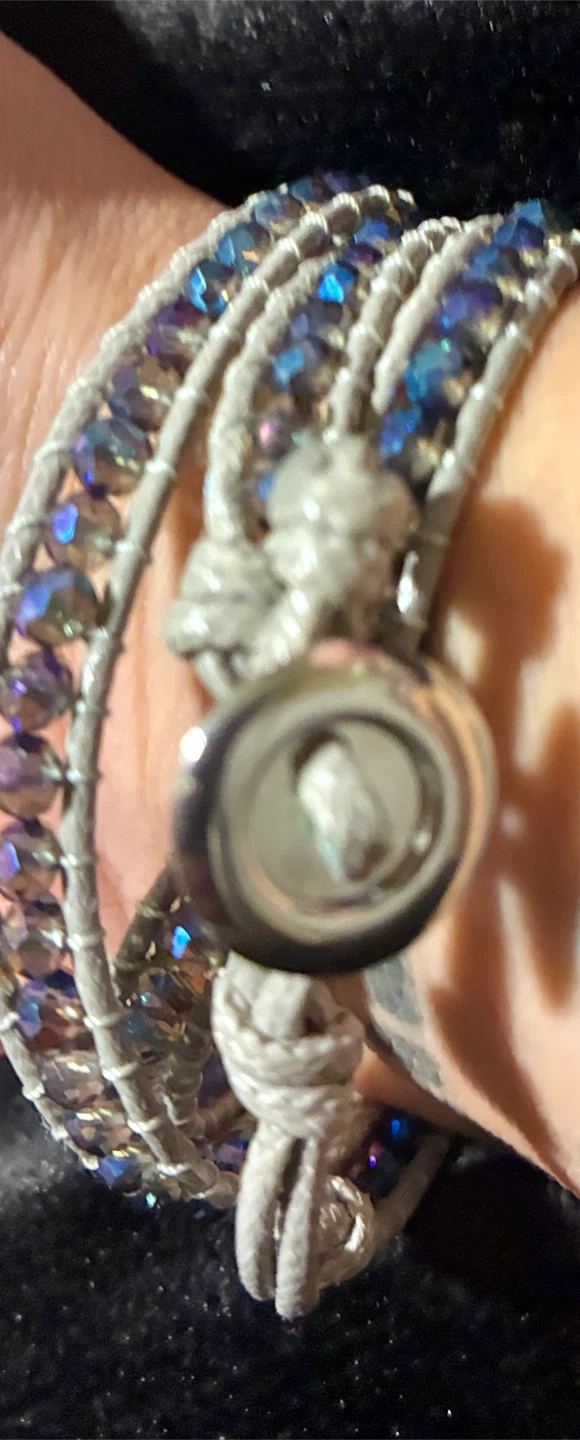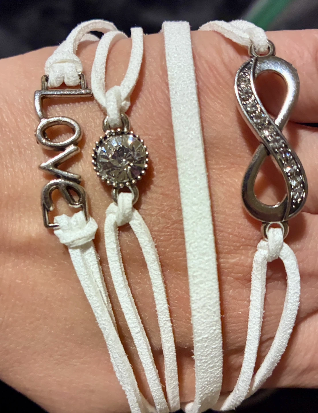 These wrap bracelets features a white cord and colorful beads. It includes 'Love' and infinity symbol charms with rhinestones. And the other gray leather with aqua blue beads. Adjustable snap closure.