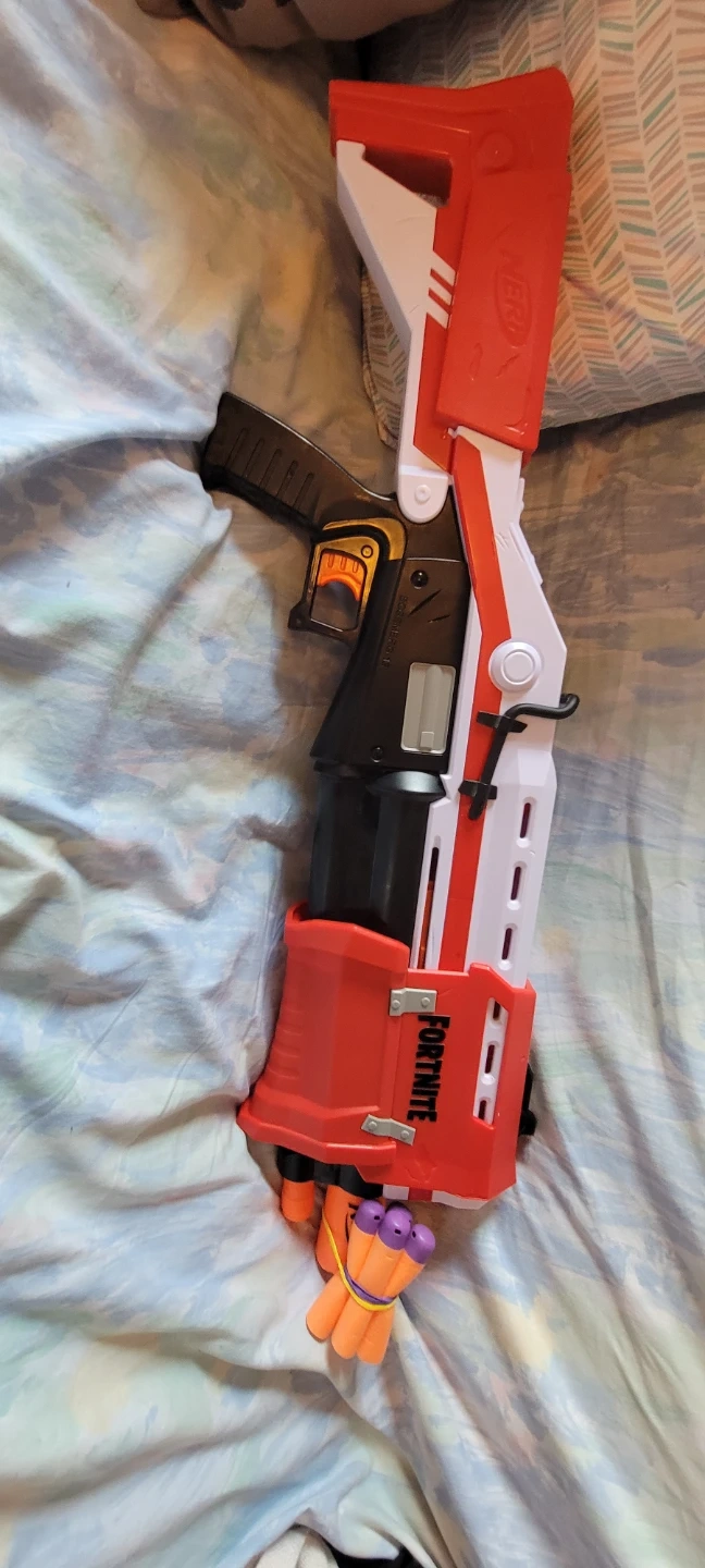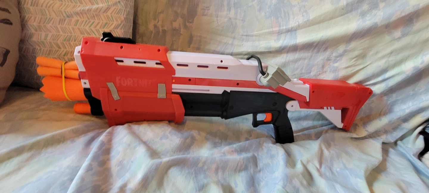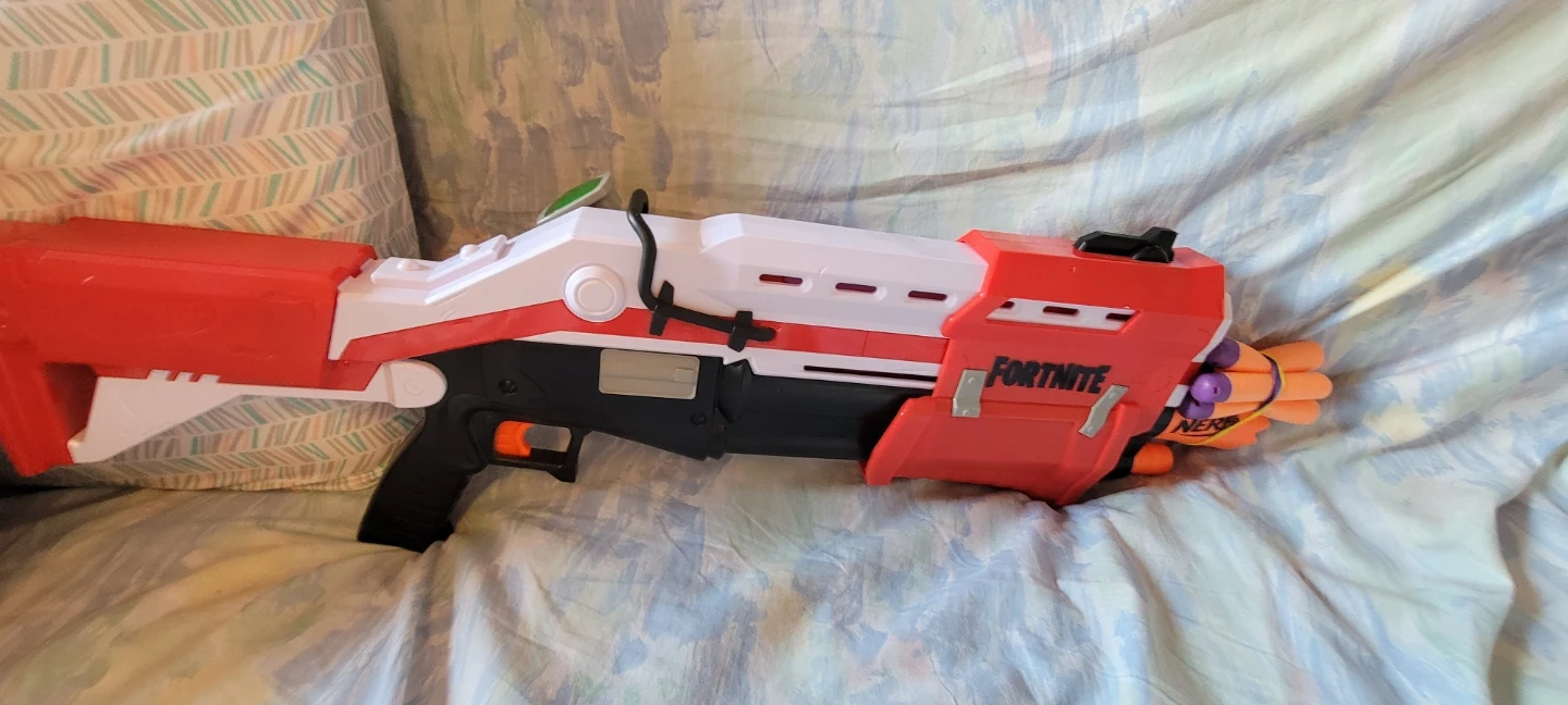 This Nerf blaster is inspired by the Rocket Launcher from Fortnite. It's red, white, and black with the Fortnite logo. Includes several darts for blasting fun! Excellent working condition