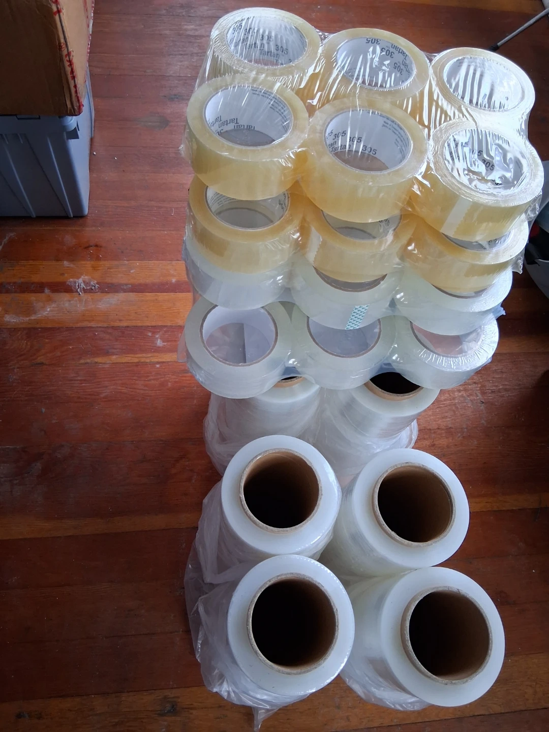This lot includes 18 rolls of packing tape and stretch wrap. The tape is clear and comes in standard rolls. The stretch wrap is also clear and individually wrapped.