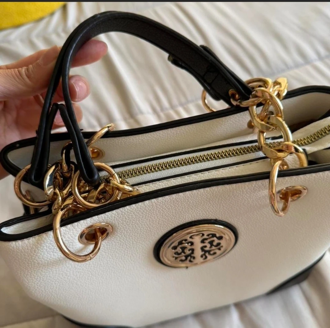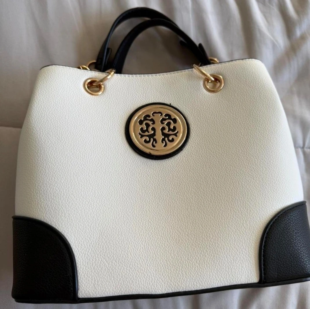 Stylish two-tone handbag with top handles and a detachable shoulder strap. Features gold-tone hardware and a decorative emblem on the front. Faux leather material.