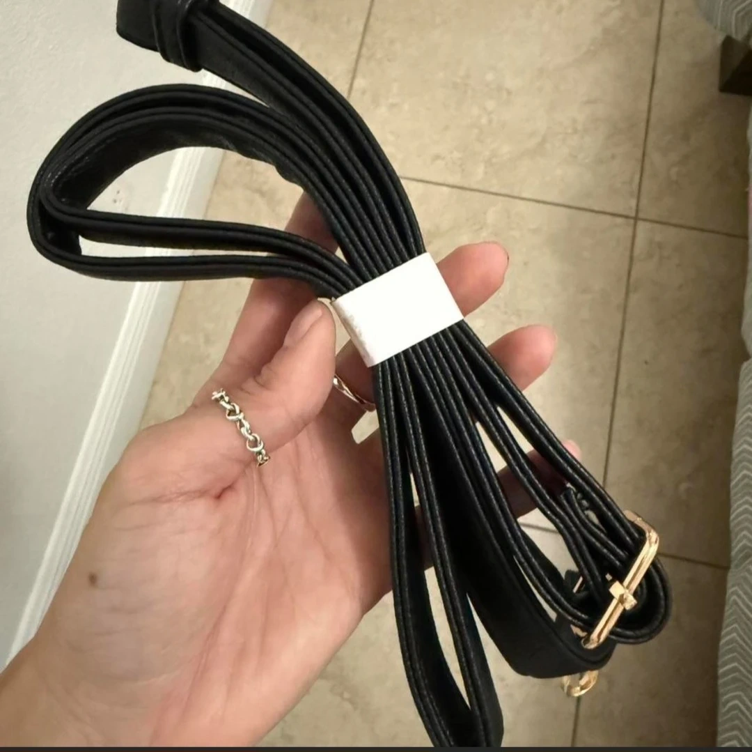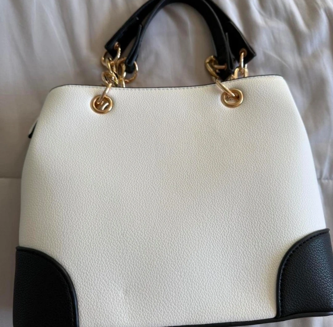 Stylish two-tone handbag with top handles and a detachable shoulder strap. Features gold-tone hardware and a decorative emblem on the front. Faux leather material.