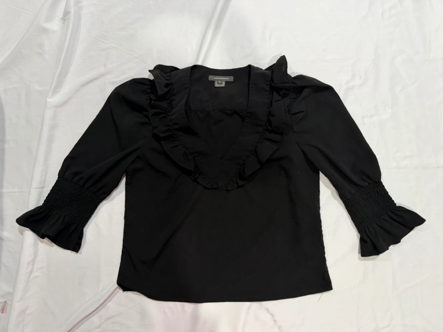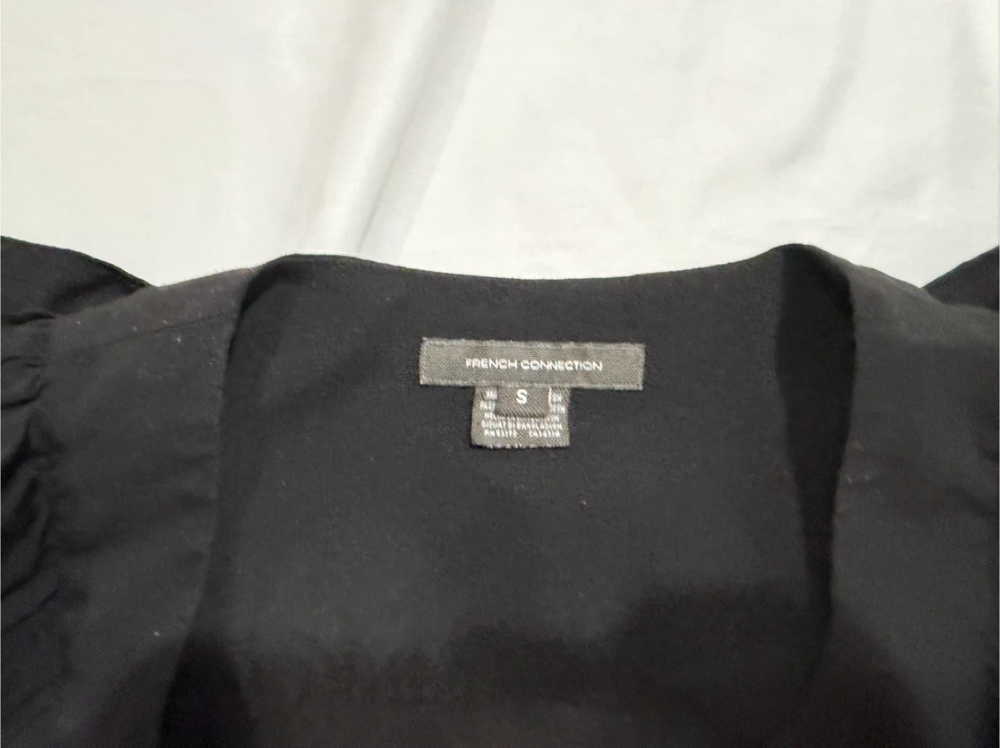 This black French Connection blouse features a ruffled neckline and sleeves. It's a size small. Polyester blend material.