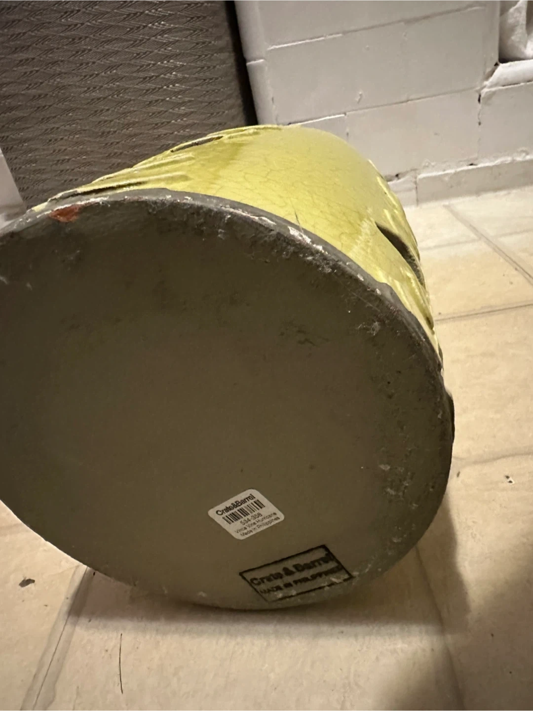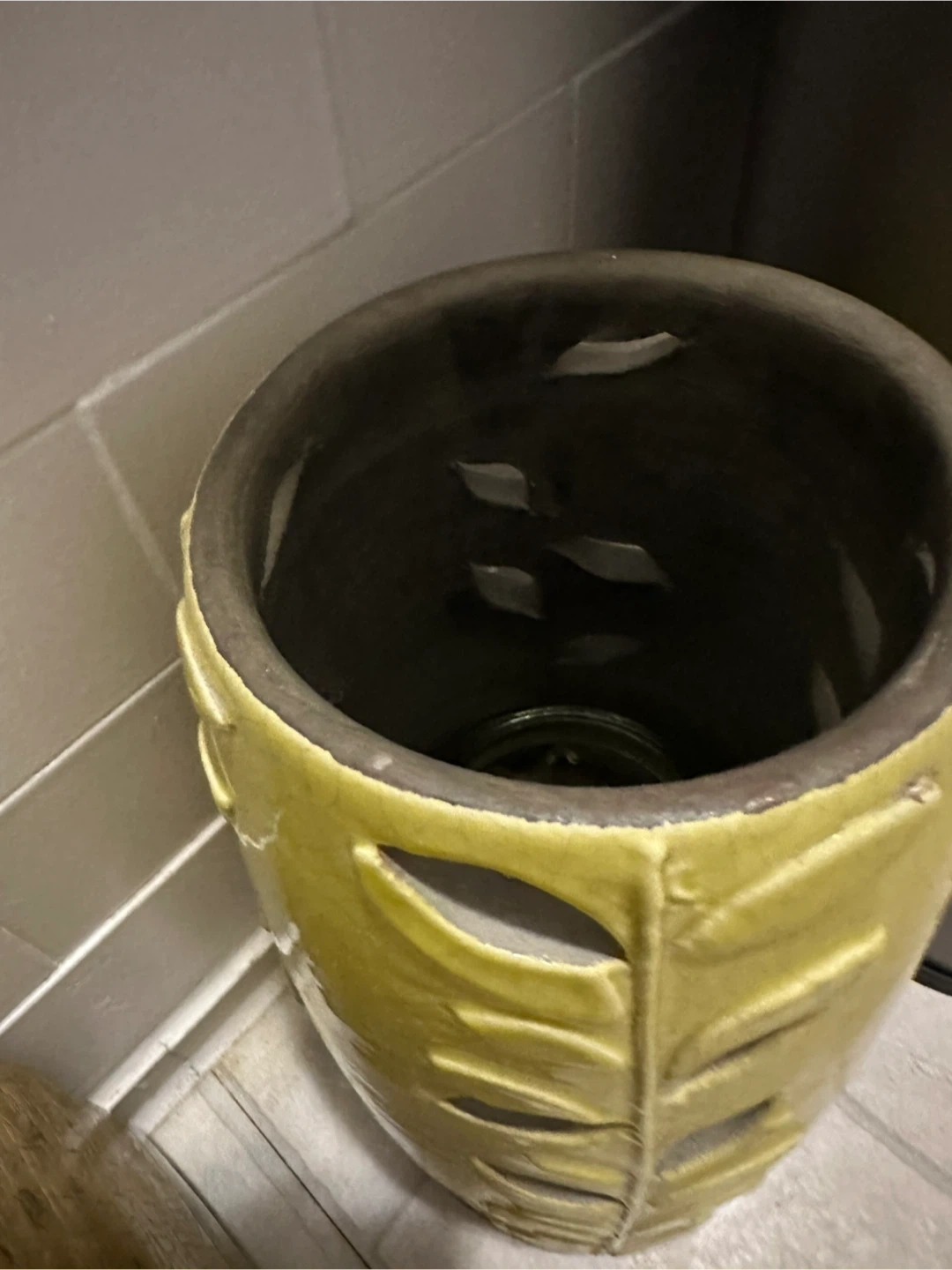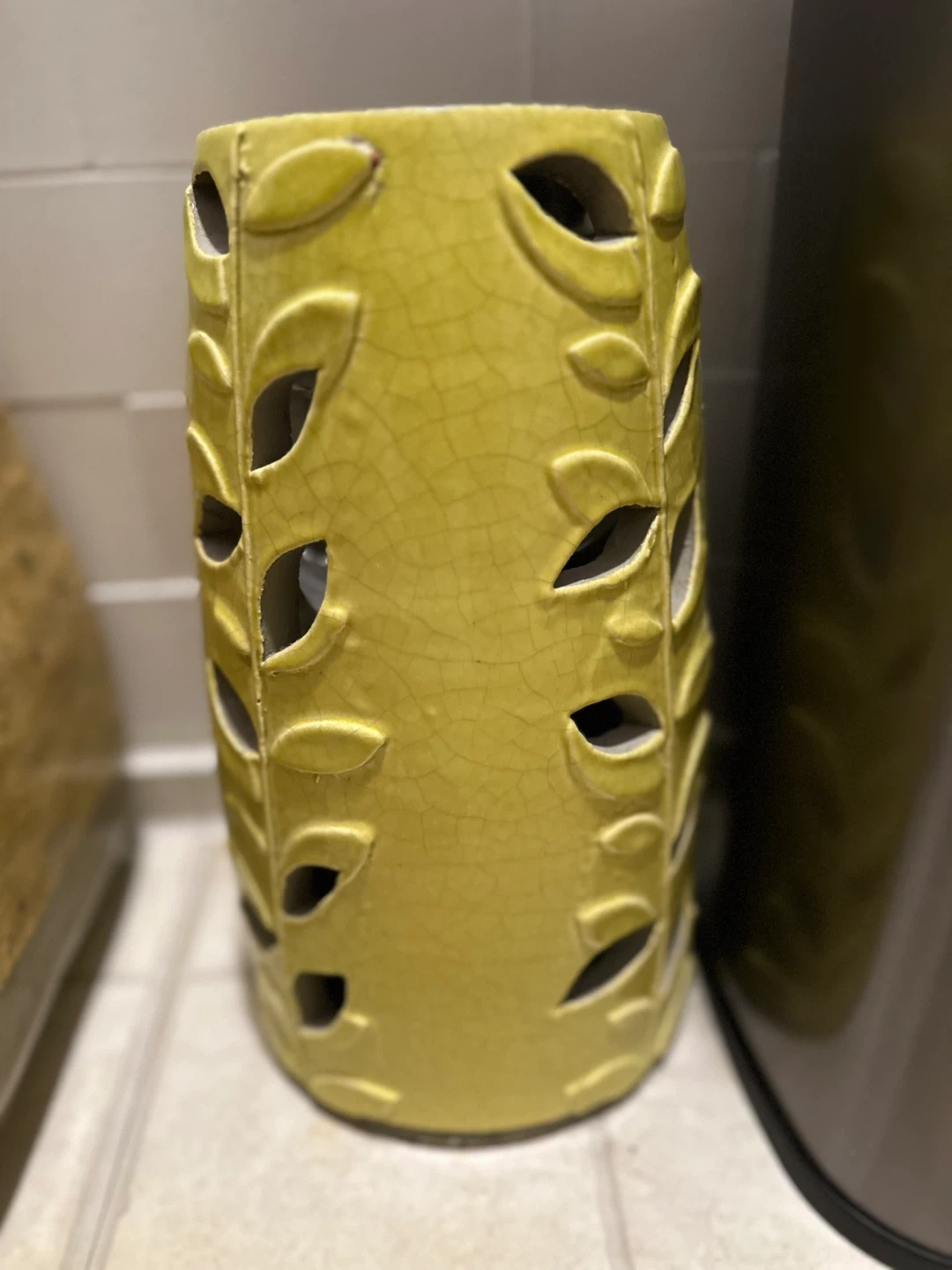 This is a West Elm vase with a celadon color and a cutout leaf design. Place a candle inside if you like and see the leaf pattern glow. It's a nice ceramic piece for your home decor.