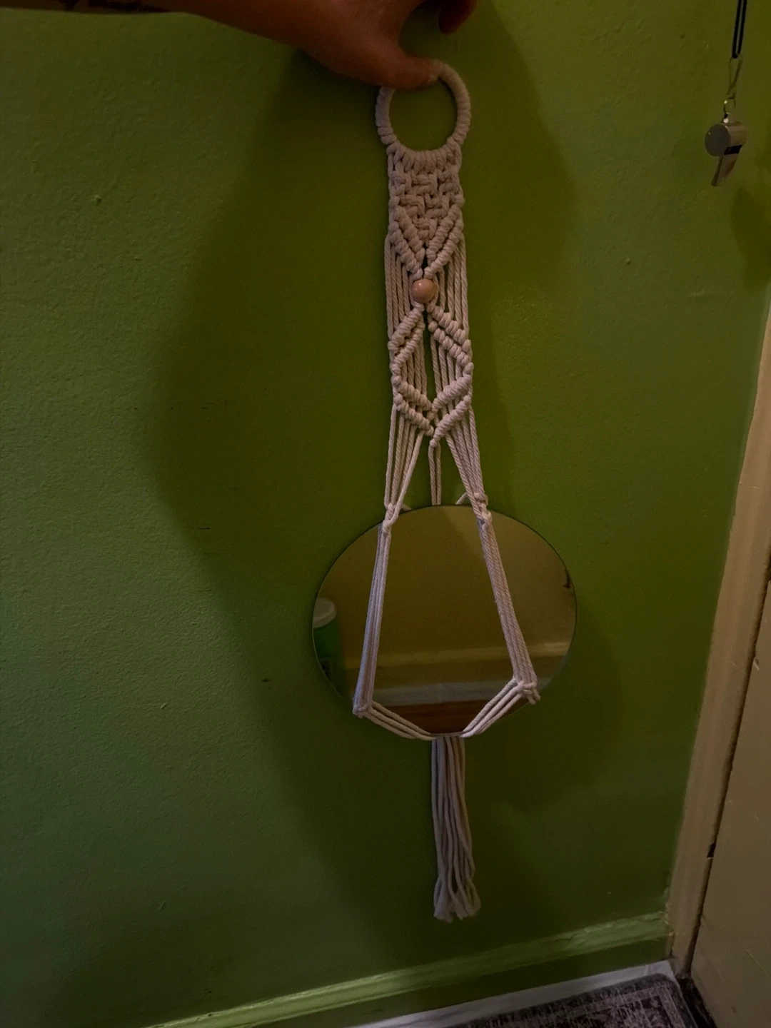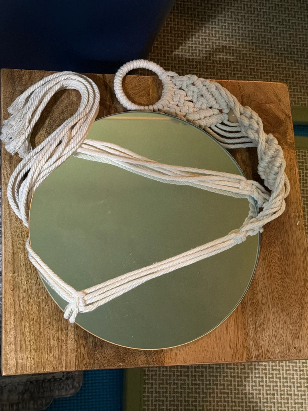 This macrame mirror wall hanging features a natural cotton cord with a wooden bead accent. It's a charming piece for bohemian or farmhouse decor. The mirror's diameter is 10 inches.