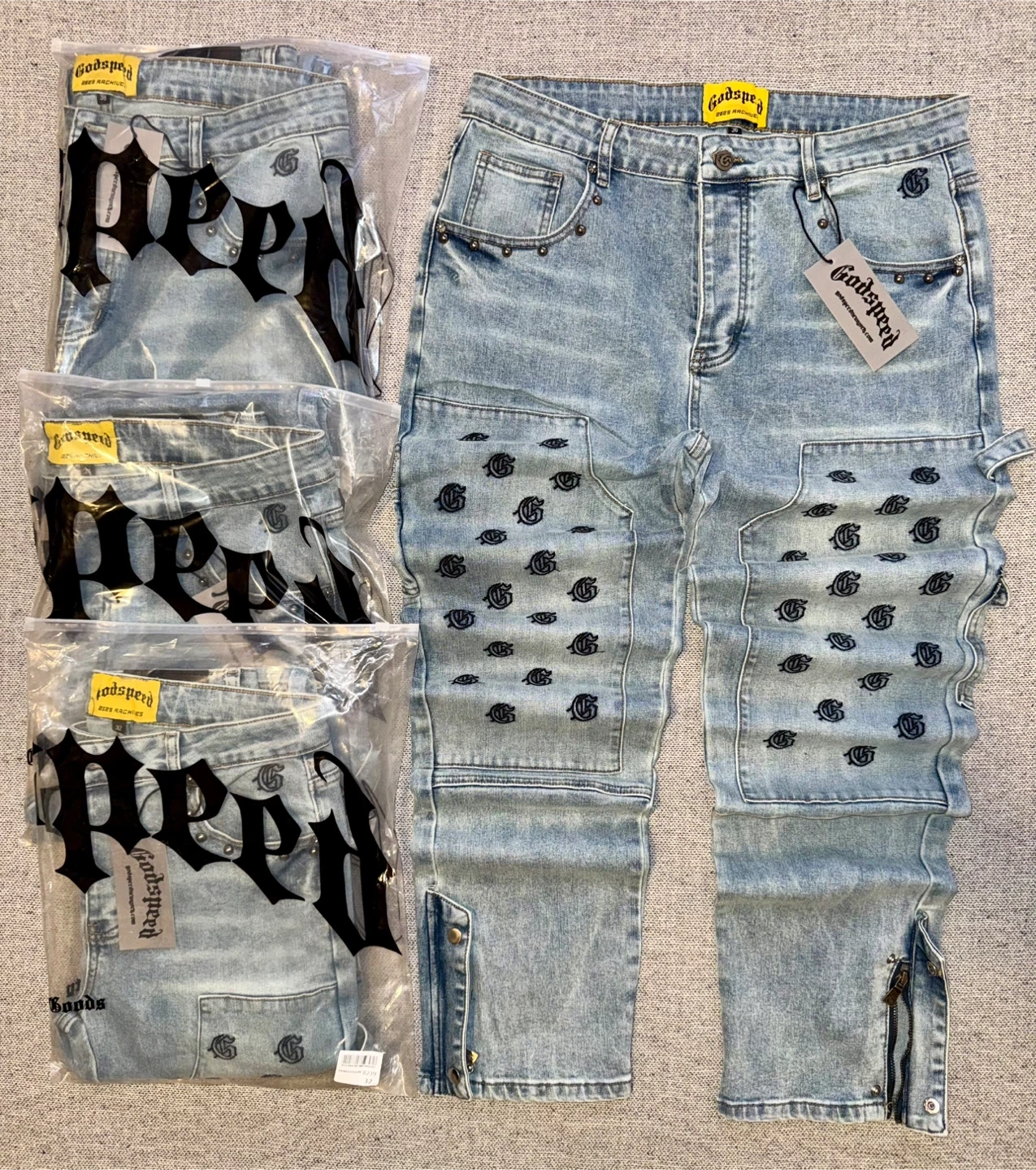 These Godspeed jeans are a light wash denim. They feature a repeating 'G' logo print throughout. Zipper and snap closures on the legs.