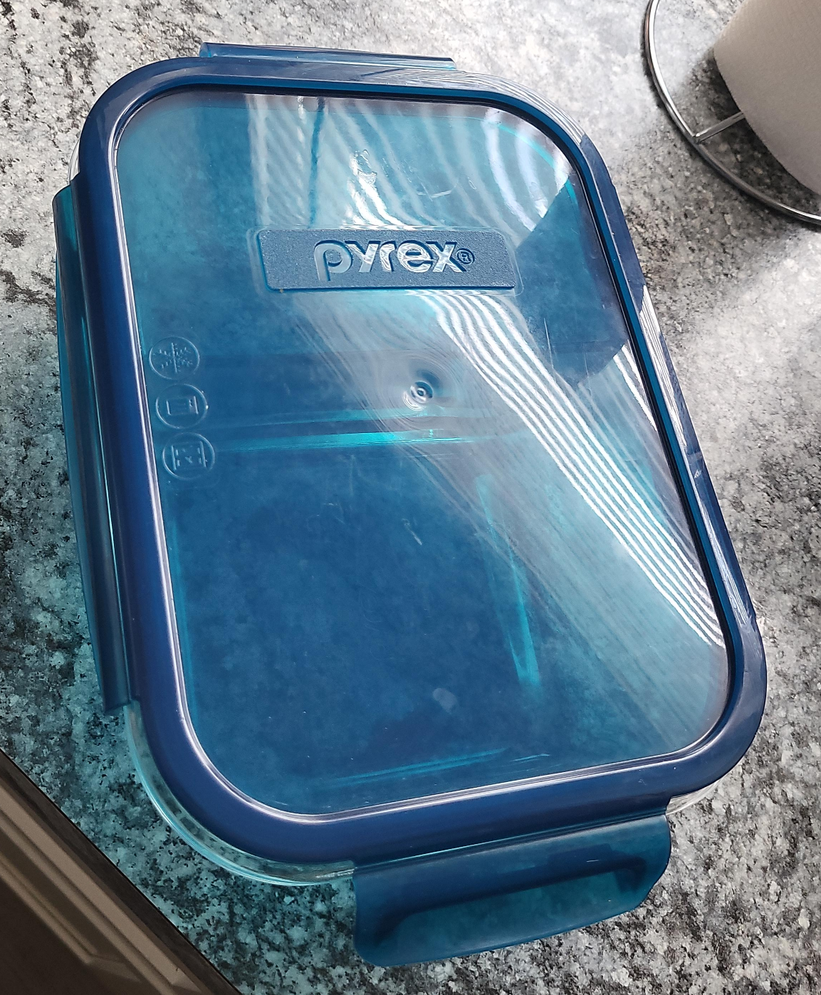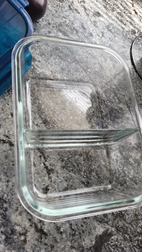 I'm selling a Pyrex divided glass food container. It's perfect for keeping your foods separated and fresh! It has a blue lid.