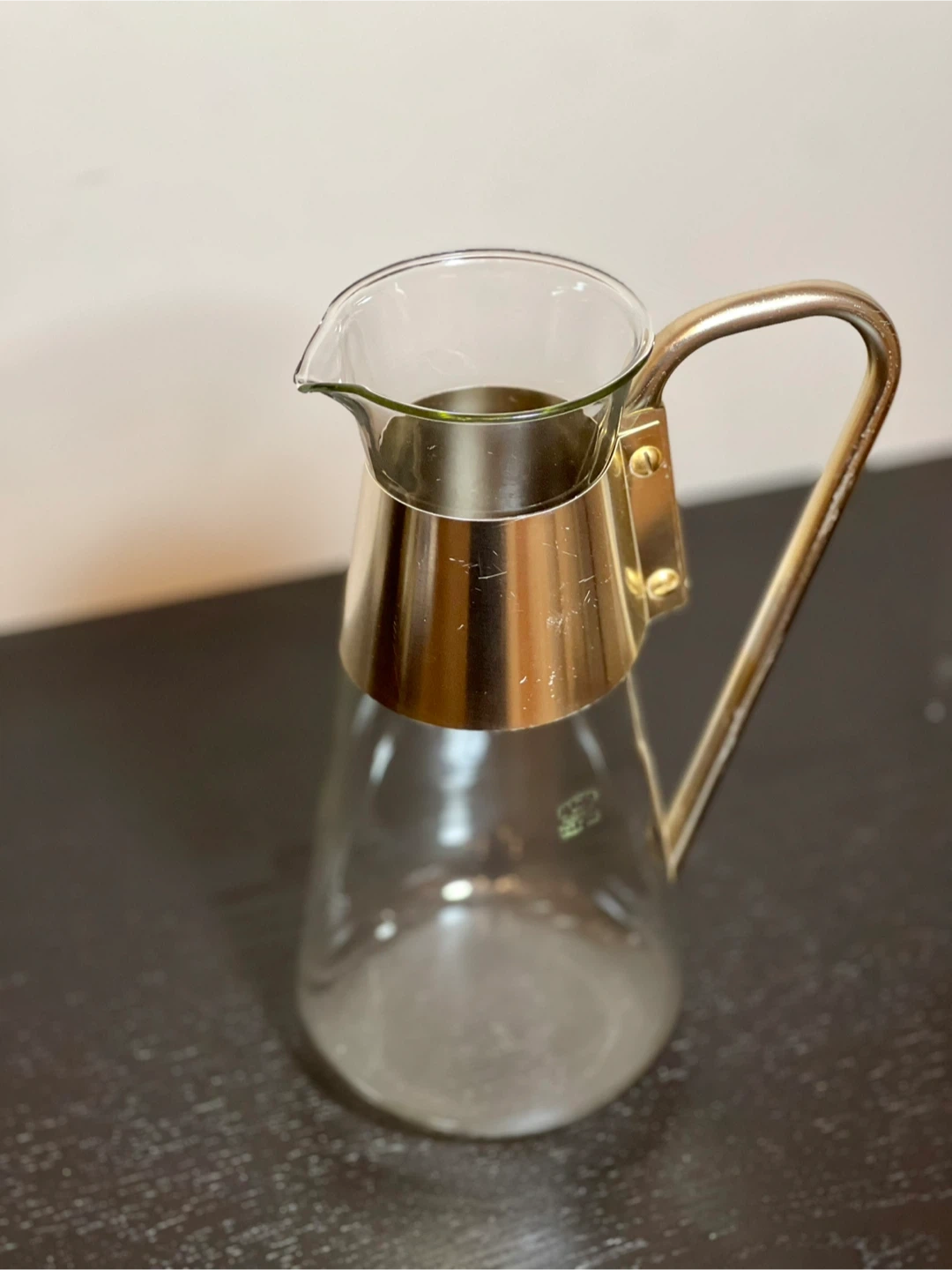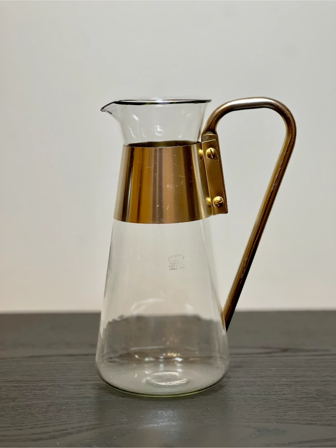 Selling a vintage Pyrex glassware beverage server with pour spout. 4 cup capacity beverage server with an aluminum handle and thick banding. This pitcher is ideal for hot or cold beverages such as coffee tea or water. This lovely carafe will be a nice addition to your mid century, bohemian, or modern decor. This carafe is 9 inches high with a 7 inch long handle, a 3 inch opening and a 4 inch base.