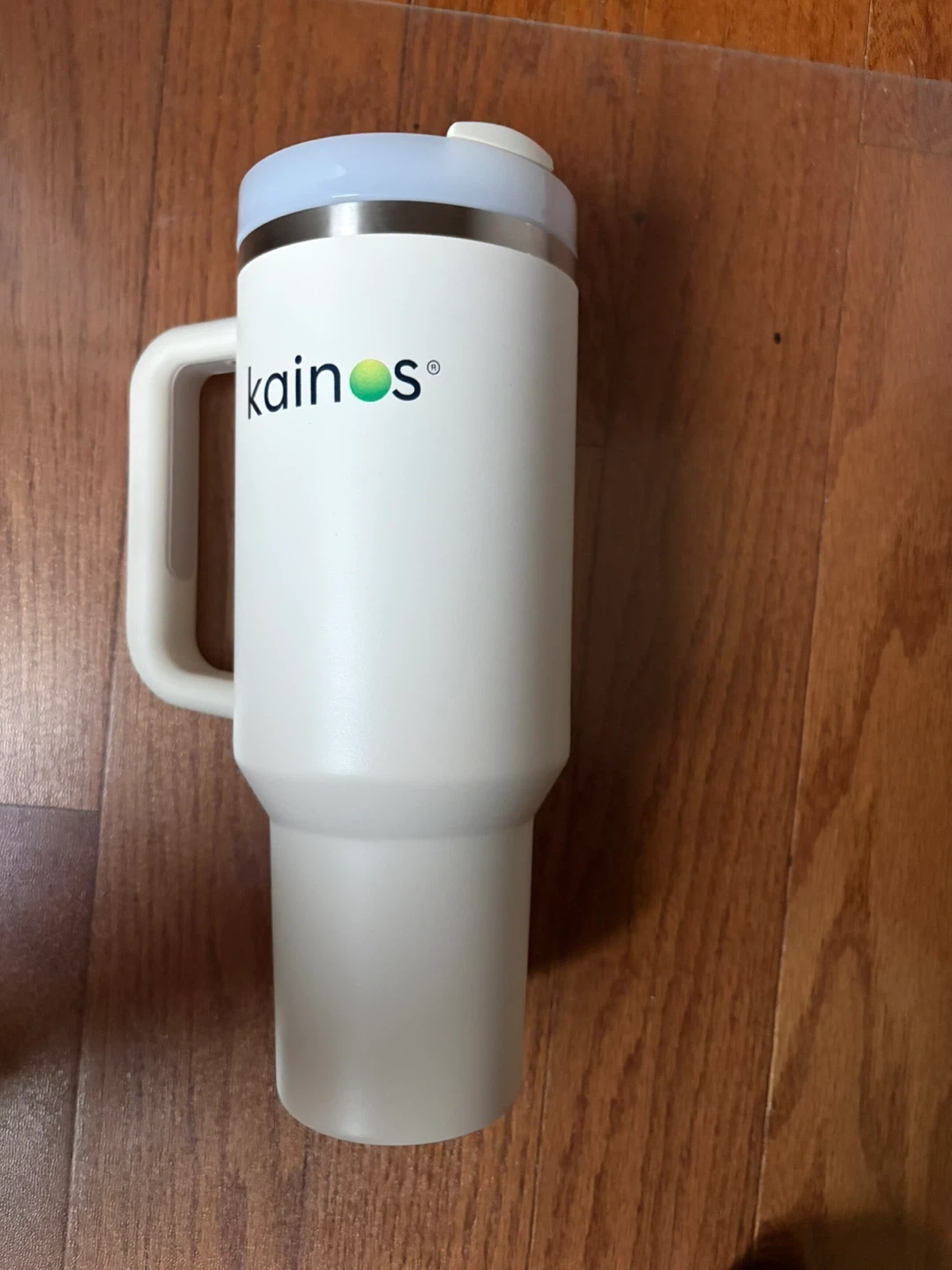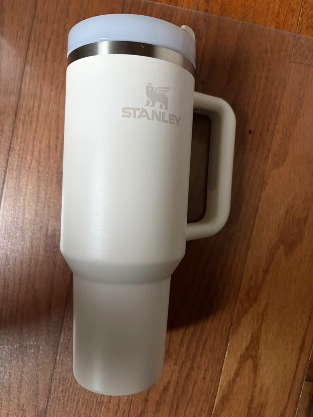 White Stanley tumbler with a handle. Insulated design keeps drinks hot or cold. Lid with spill-resistant opening included. Fits most car cup holders. 40 oz