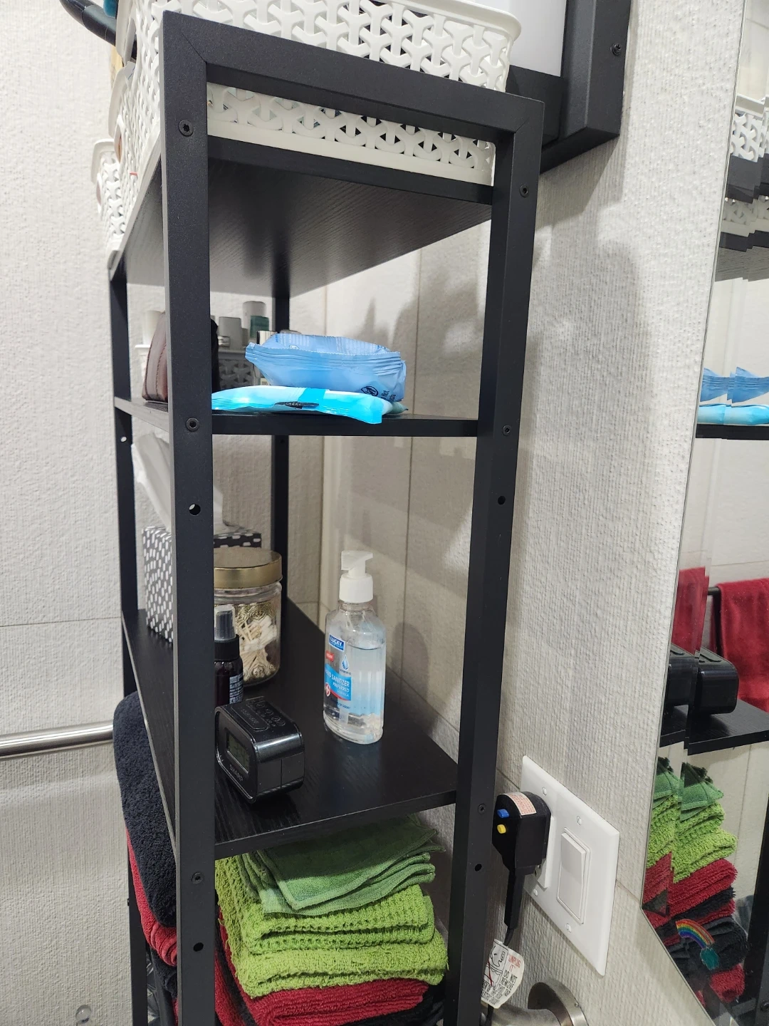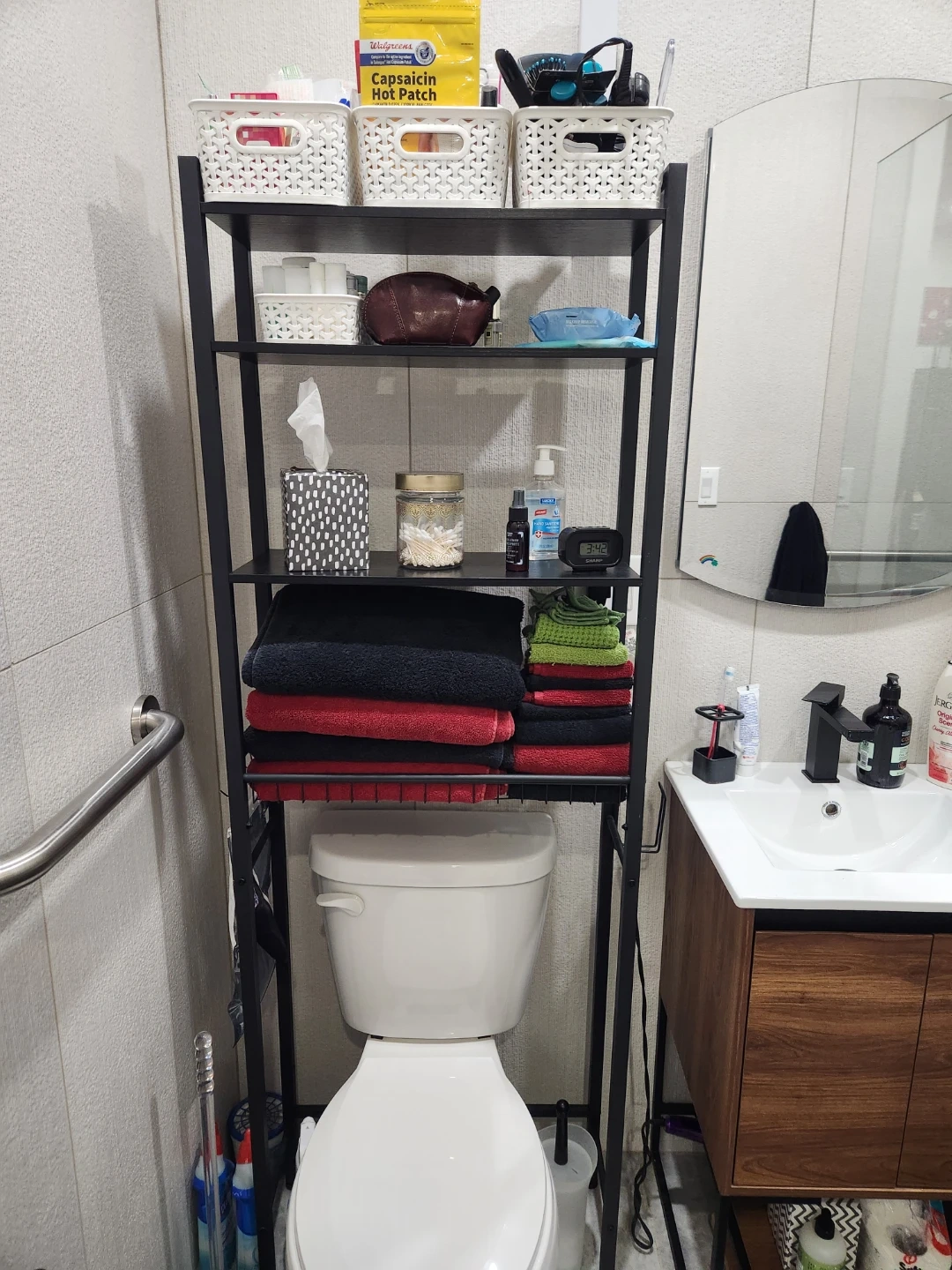 This black metal shelf organizer has four tiers for storage. It's designed to fit over a toilet. The unit is constructed from metal with a black finish.