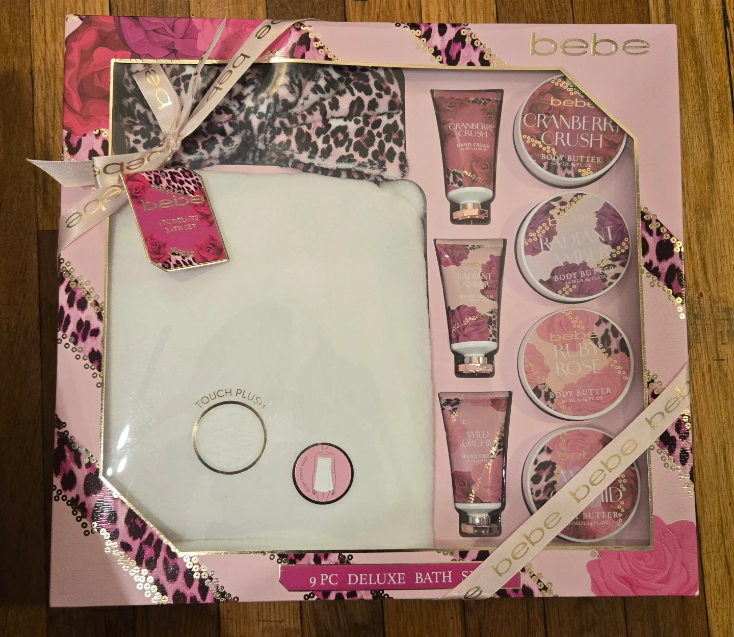 This Bebe 9 piece deluxe bath set includes a plush towel wrap and various body care items. The set features hand creams and body butters in scents like Cranberry Crush, Radiant Amber, Ruby Rose, and Wild Orchid. Each product is 50ml or 1.69 fl.oz.