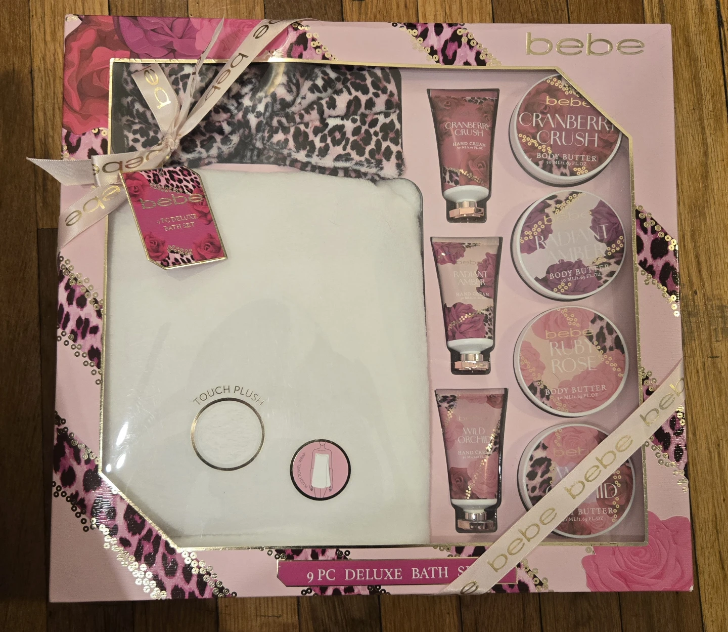 This Bebe 9 piece deluxe bath set includes a plush towel wrap and various body care items. The set features hand creams and body butters in scents like Cranberry Crush, Radiant Amber, Ruby Rose, and Wild Orchid. Each product is 50ml or 1.69 fl.oz.