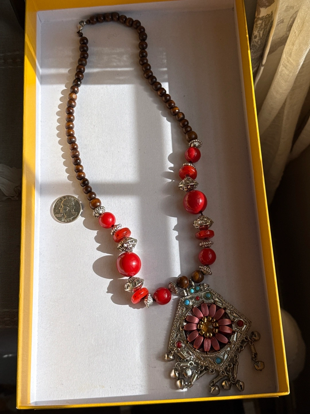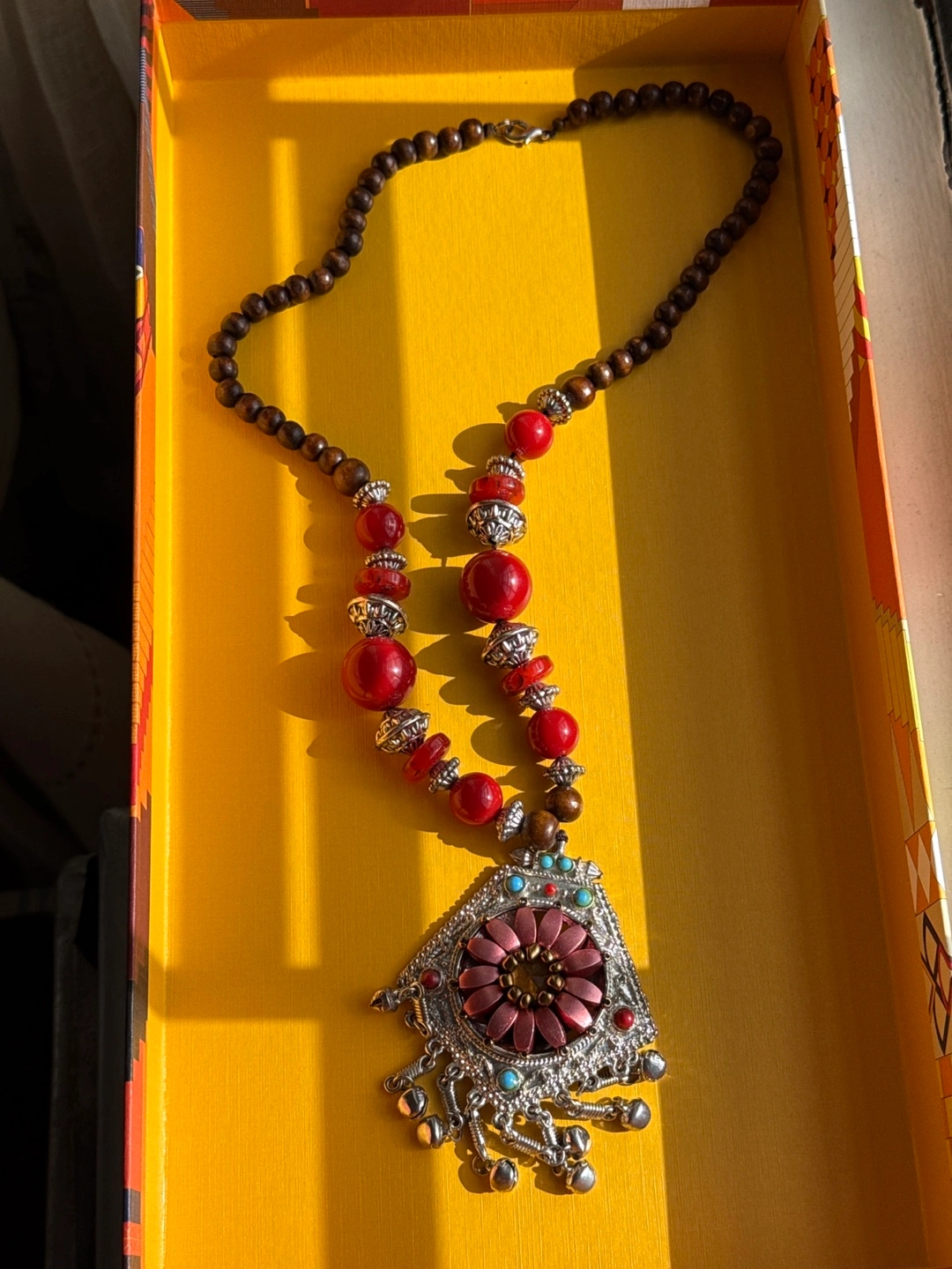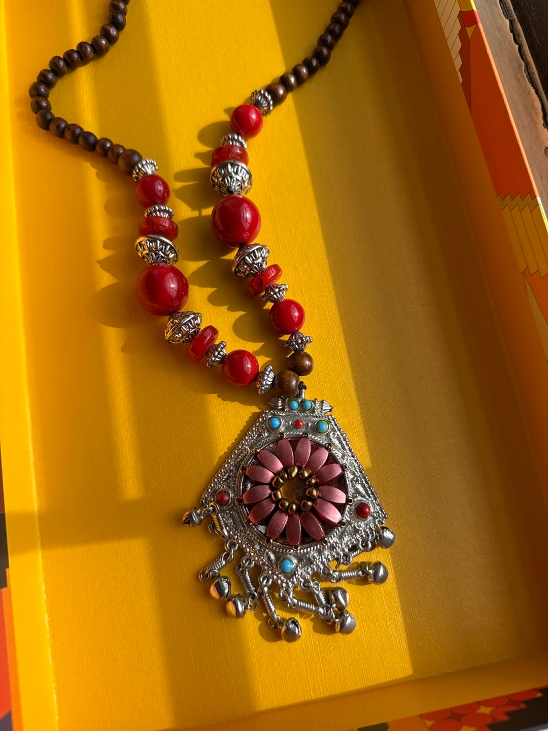 Selling a unique beaded necklace with a silver-colored pendant. The necklace features a mix of red and brown beads, complemented by silver-colored accents. The pendant showcases a floral design with red, turquoise, and brown details. It's in great condition. Box is not included.