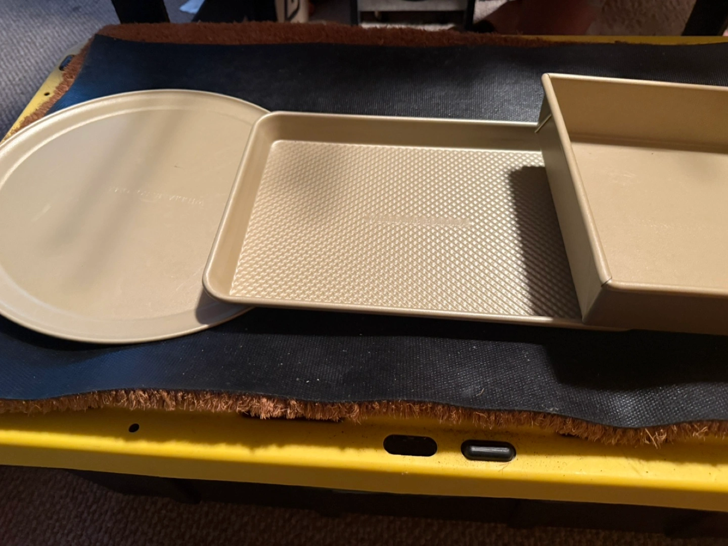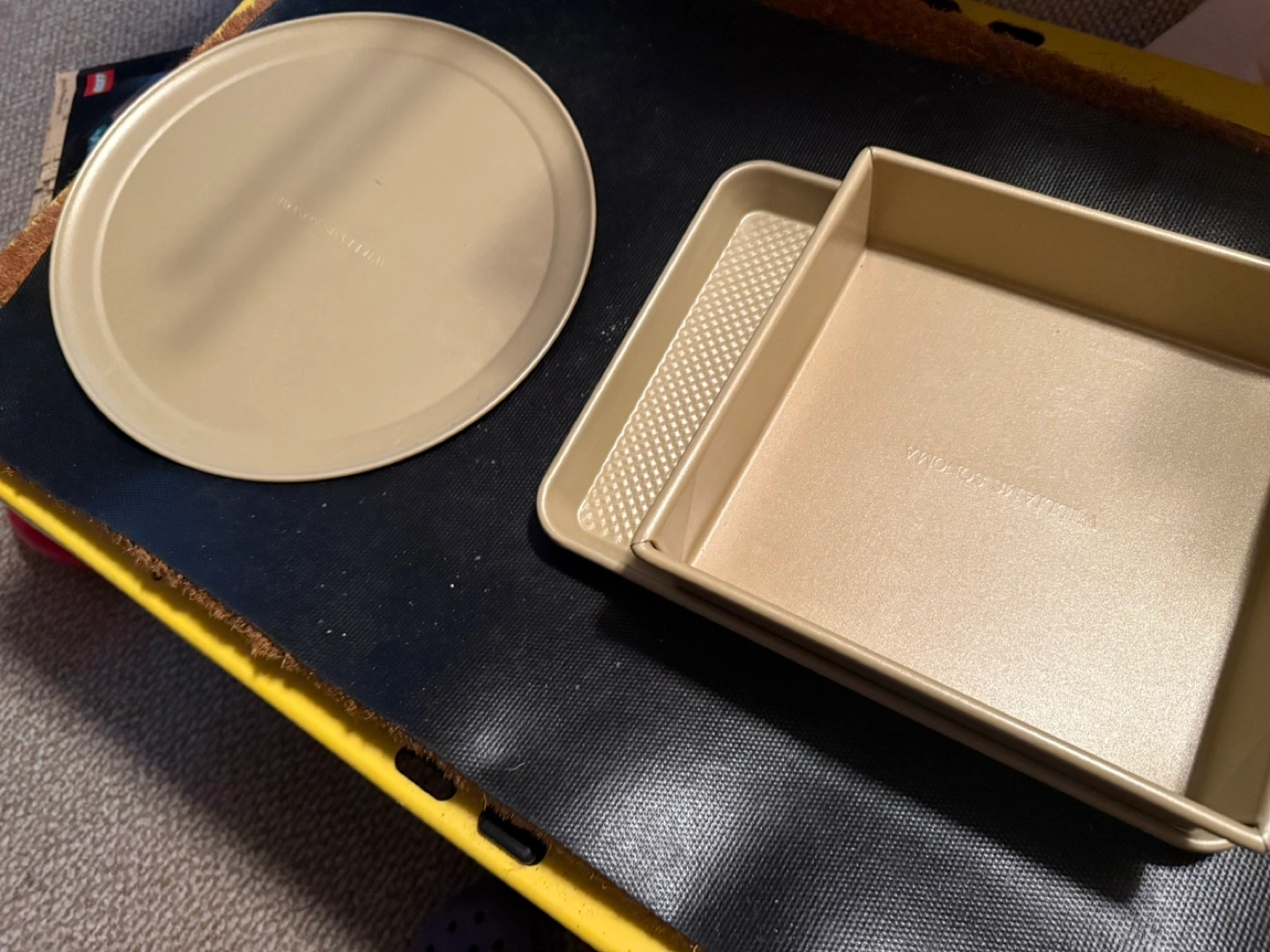 Selling a set of three nonstick bakeware pieces in a gold color. Includes a round pizza pan, a rectangular baking sheet, and a square cake pan. Great for all your baking needs!
