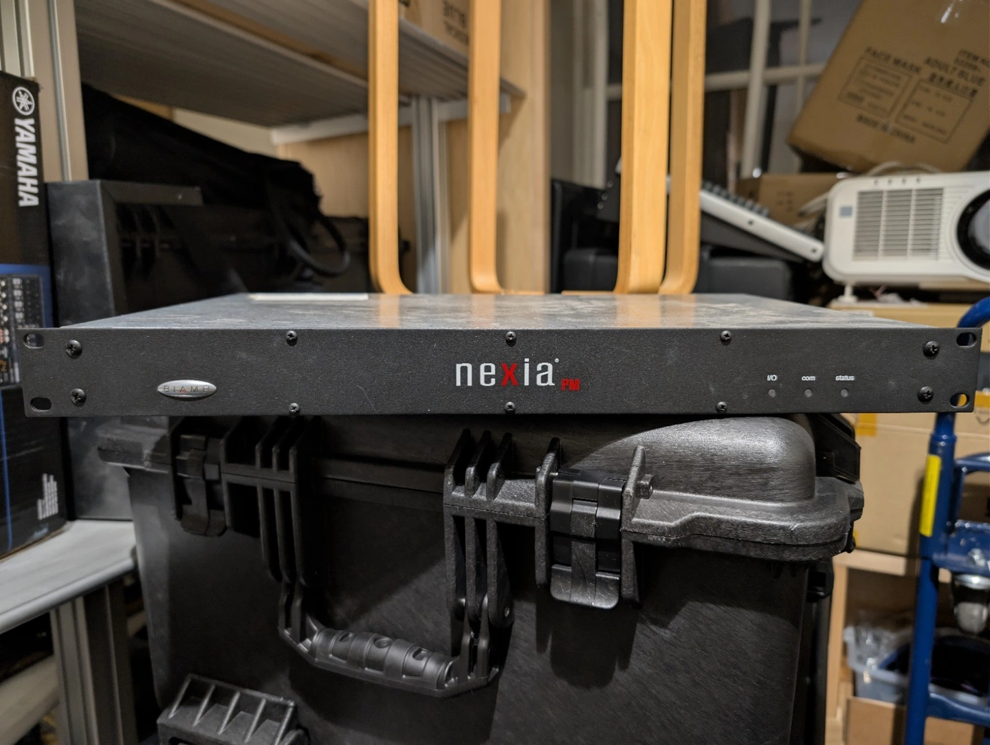 Used Biamp Nexia PM digital signal processor. Rack-mountable (1U) with 10 inputs and 6 outputs. Features include equalizer and various ports (Ethernet, RCA, mic/line, control, serial, VGA). Gray color.
