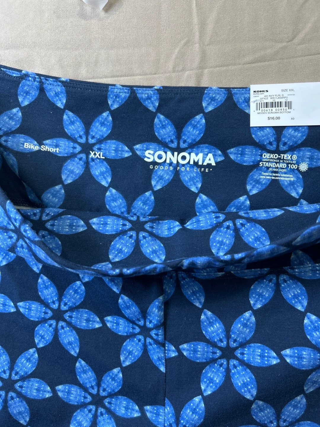 Sonoma Goods for Life bike shorts in size XXL. High rise, slim fit hitting just above the knee. Made with 57% cotton, 38% polyester, and 5% spandex. Tested for harmful substances.
