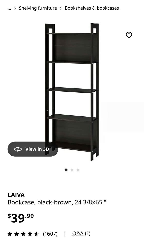 Selling IKEA LAIVA bookcases in black-brown. Dimensions are 24 3/8" x 65". These are already assembled and are easy to carry. Great for displaying books or collectibles. They are in great condition. Selling for $15 each, with a discount available if you buy multiple.