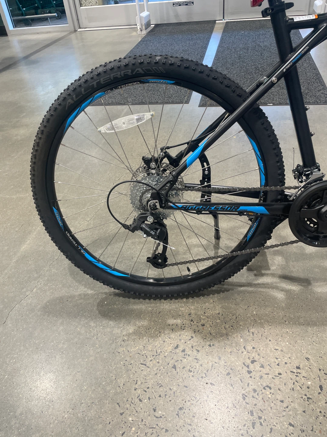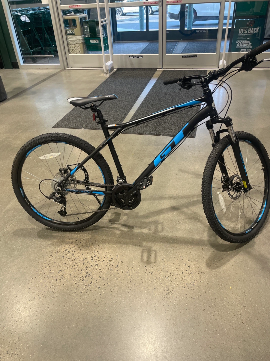 This is a GT Aggressor Pro mountain bike with a black frame and blue accents. It features disc brakes and a front suspension fork. This bike is suitable for trail riding.