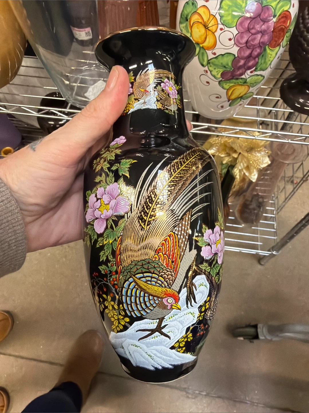 Black Vase with Pheasant and Floral Design